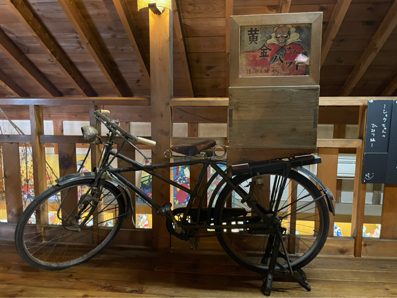 古い大きな自転車に紙芝居の用具一式、