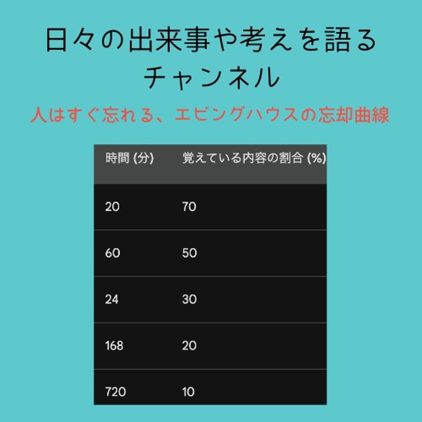これは、エビング・ハウスさんっていうですね、19世紀から20世紀のドイツの心理学学者、ヘルマン・エビング・ハウスさんがですね、忘却曲線っていうのを発明しまして、そこでですね、もうデータが出てるんですよ。