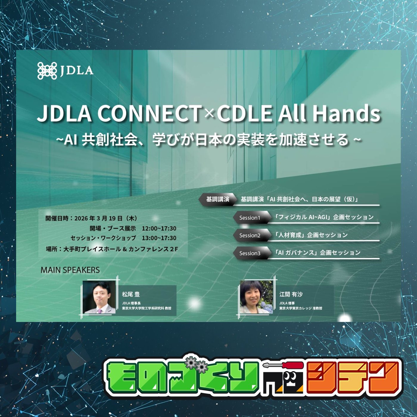 それでは早速行きましょう。私が参加するイベントなんですけども、3月の19日木曜日、来週の木曜日ですね、東京で行われますJDLAコネクトシードルオールハンズAI競争社会、学びが日本の実装を加速させるという、すごいかっこいいね。