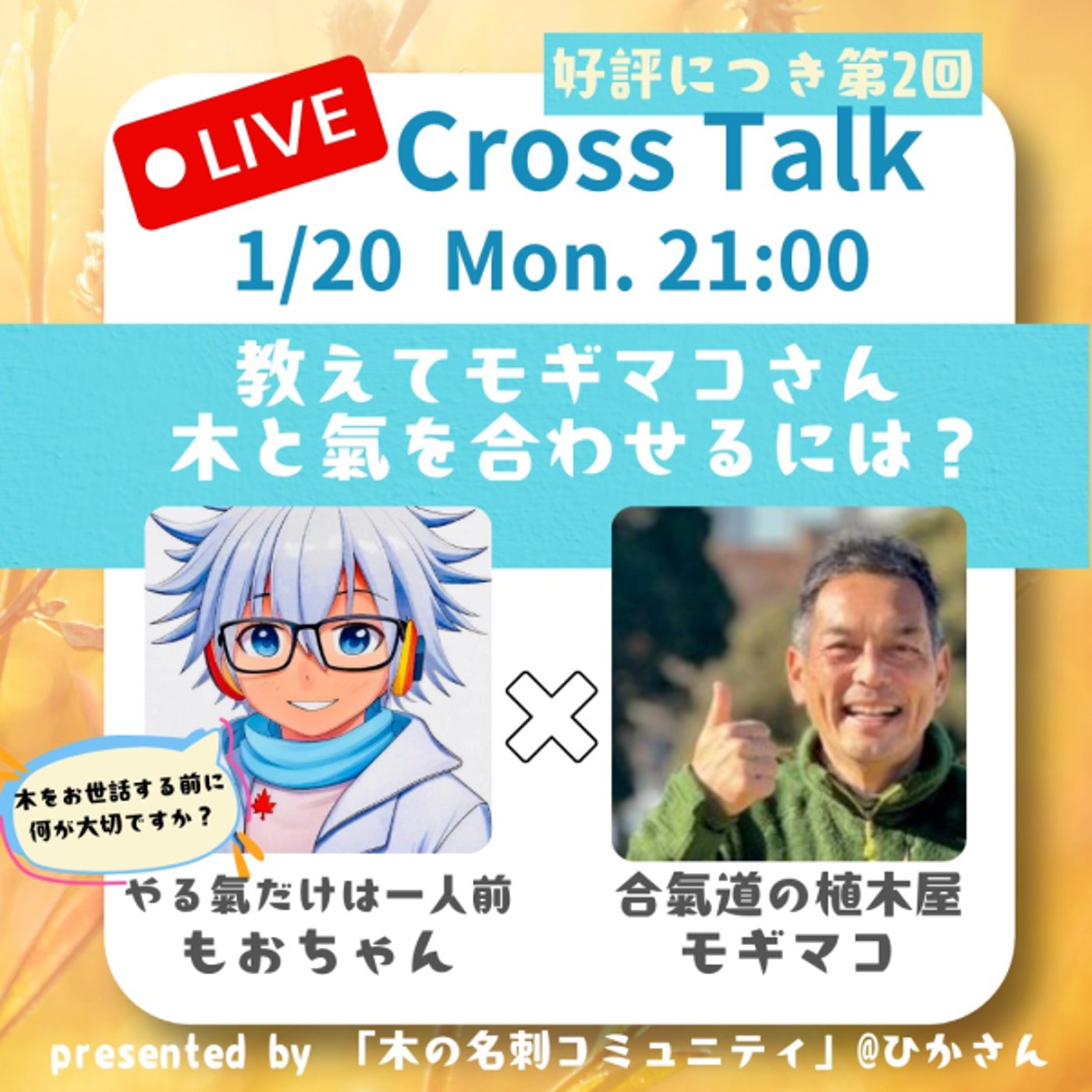 自然のお医者さんの見習いであるモーちゃんと、それから植木屋さんであるMogimakoさんと対談ができたら面白いなと思ってですね、やらせていただくっていうことになりました。