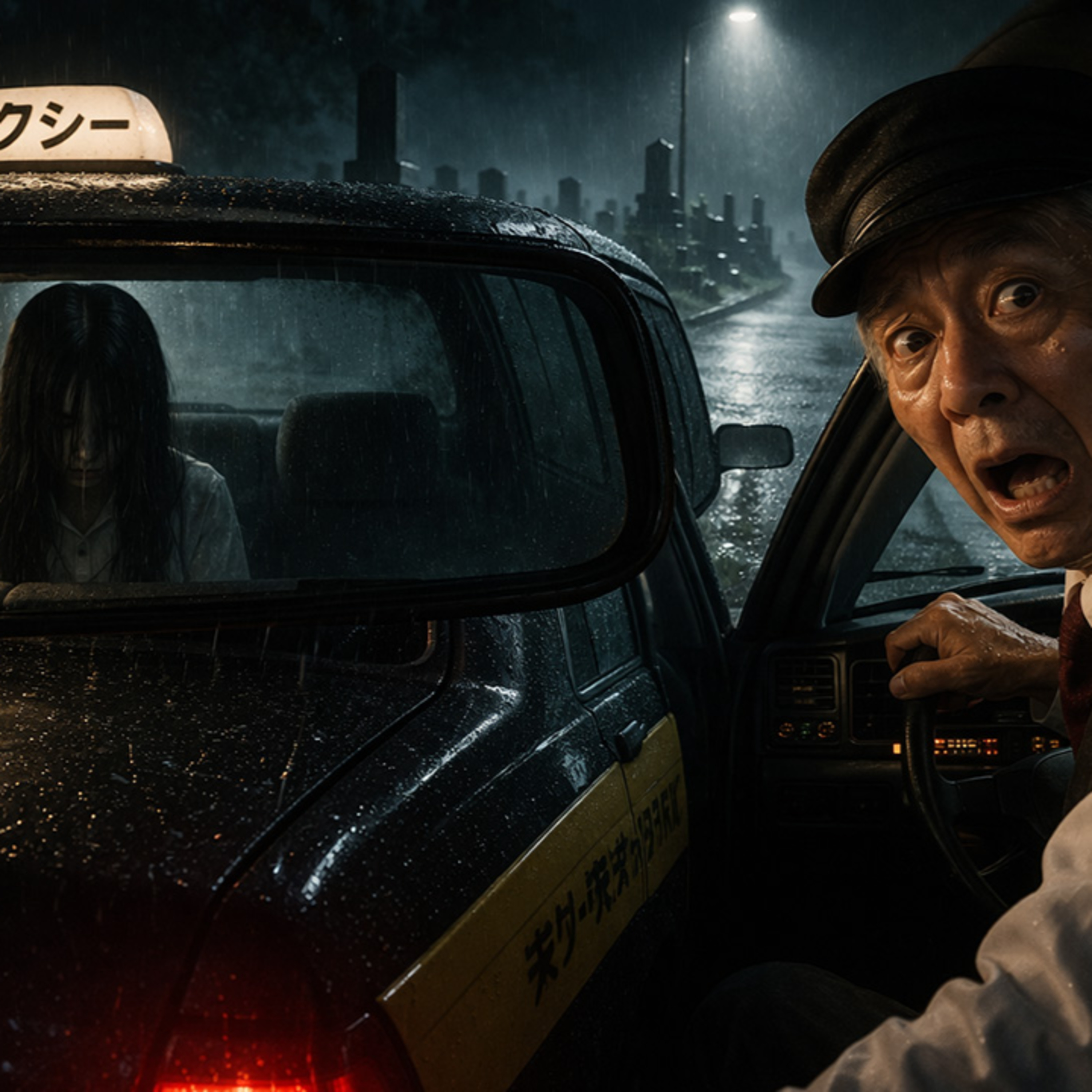 雨の金曜日の深夜、霊園を抜ける近道を走っていたタクシードライバーのAさんは、不気味な怪談を思い出しながら車を走らせていた。