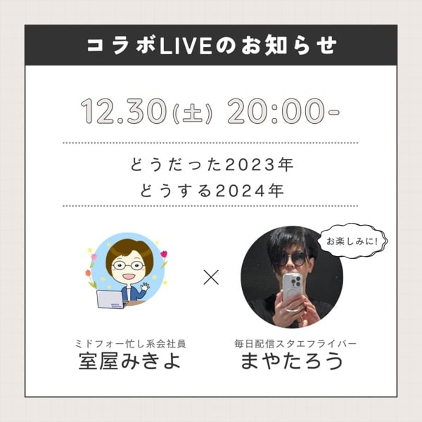 こんばんは、室屋みきよです。今はですね、2023年12月30日の夜19時59分です。