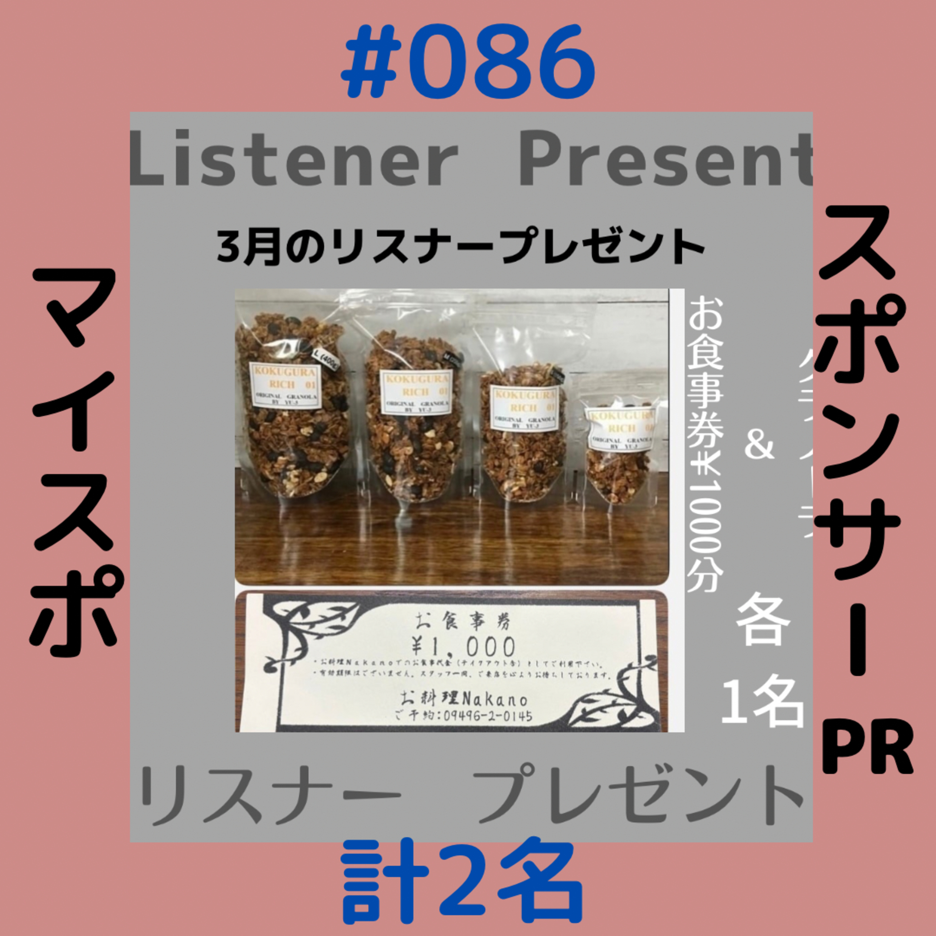 このエピソードでは、パーソナリティのマイコが、3月のスポンサー企業を紹介し、リスナーへのプレゼント企画を発表します。プレゼントは、1分の1提供のハーブティーと乳酸菌サプリメントのセット、そしてお料理ナカノとお料理絵本館で使える食事券とグラノーラのセットです。各スポンサー企業(寺岡環境サービス、ガレージ吉田、みのり、絵本館きのうた、お料理ナカノ、ノエビア化粧品、アイアンワークスYu-3)のサービスやイベント情報が詳しく紹介され、リスナーに積極的な参加を呼びかけています。また、番組へのメッセージやプレゼント応募方法についても案内されています。