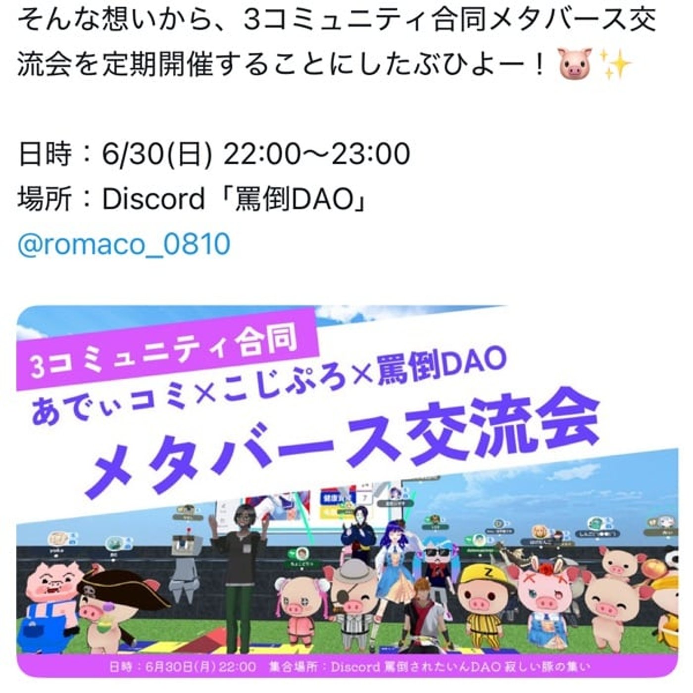 こんにちは、ナナゼロです。今日の夜のお知らせをさせてください。本日22時から、バトー・ダオ×アディコミ×コジプロのメタバース交流会というのをさせていただきます。