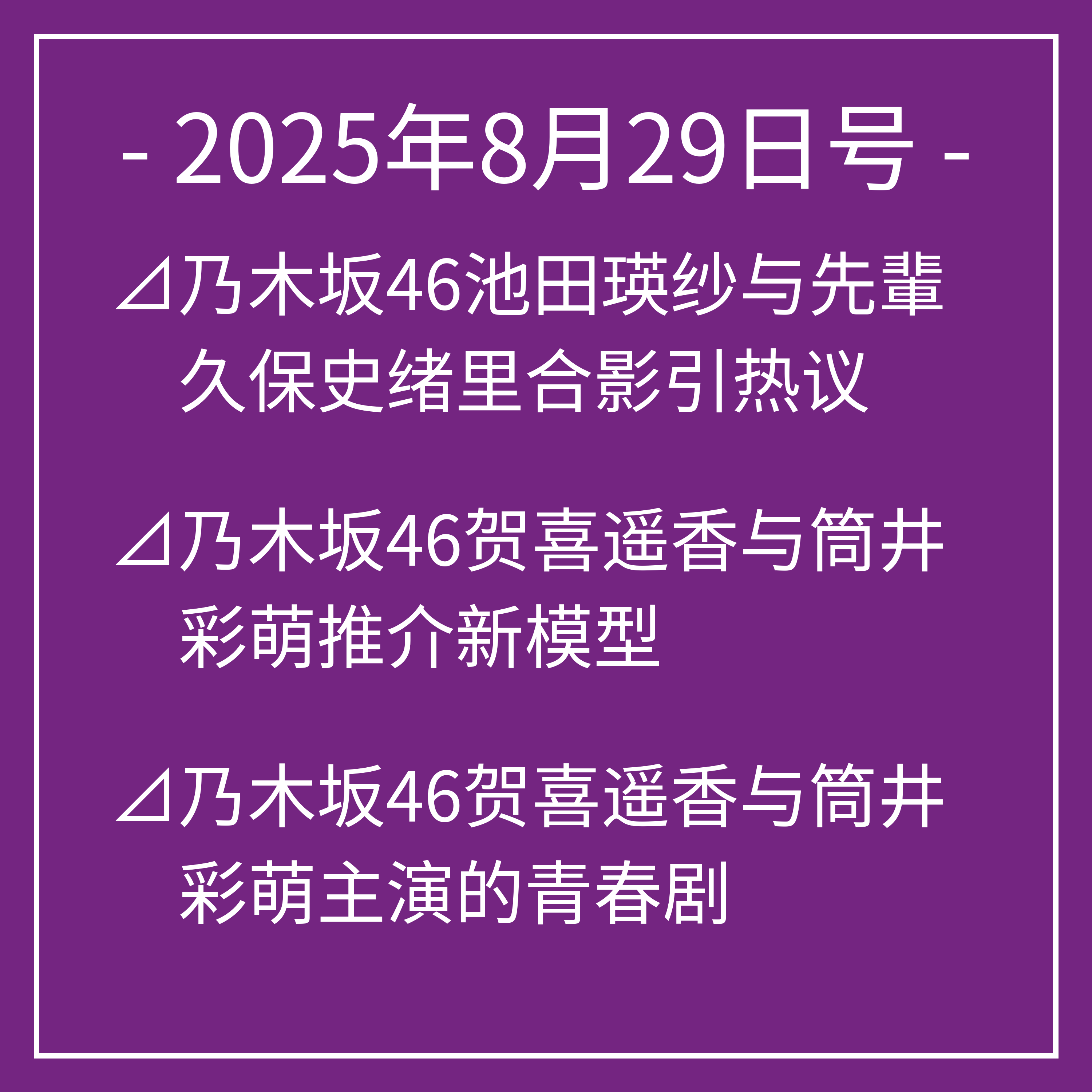 8月29日号⊿乃木坂46池田瑛纱与先輩久保史绪里合影引热议⊿乃木坂46贺喜遥香与筒井彩萌推介新模型⊿乃木坂46贺喜遥香与筒井彩萌主演的青春剧⊿乃木坂46首次参加综艺引发粉丝热议⊿乃木坂46井上和展现成熟魅力引热议…