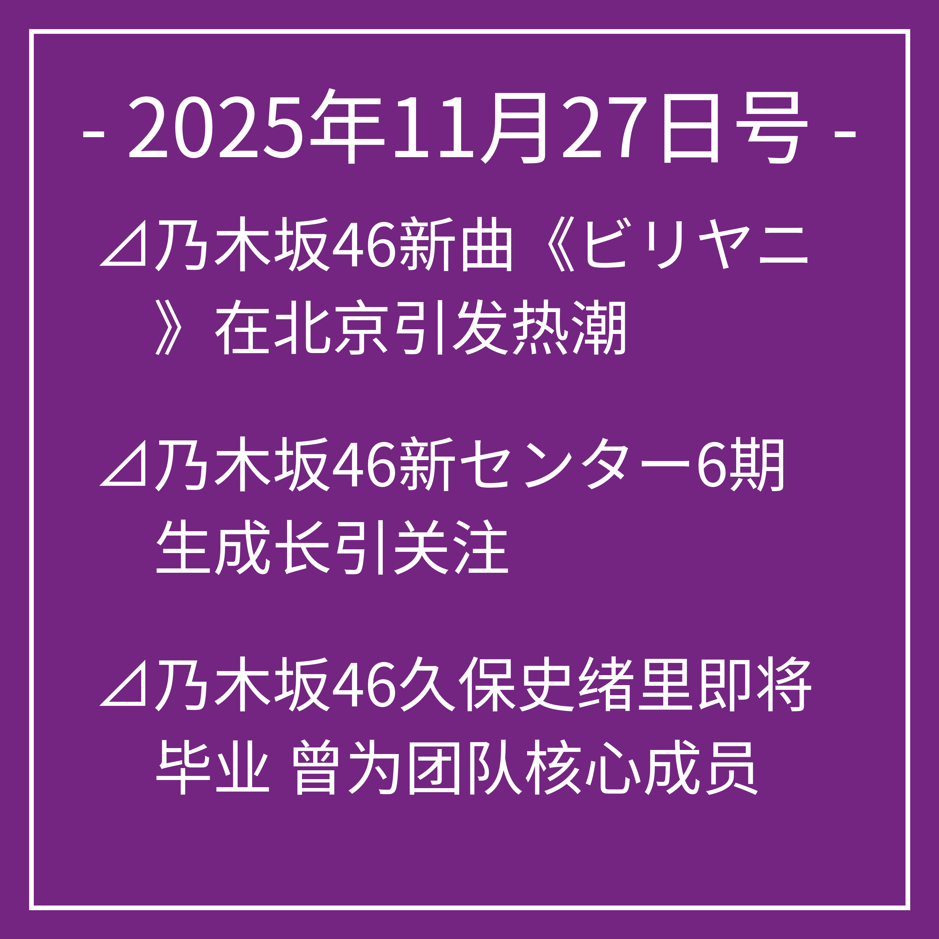 11月27日号⊿乃木坂46新曲《ビリヤニ》在北京引发热潮⊿乃木坂46新センター6期生成长引关注⊿乃木坂46久保史绪里即将毕业 曾为团队核心成员⊿乃木坂46久保史绪里最后演出 感动粉丝⊿乃木坂46与田祐希等亮相《bis》冬号封面…