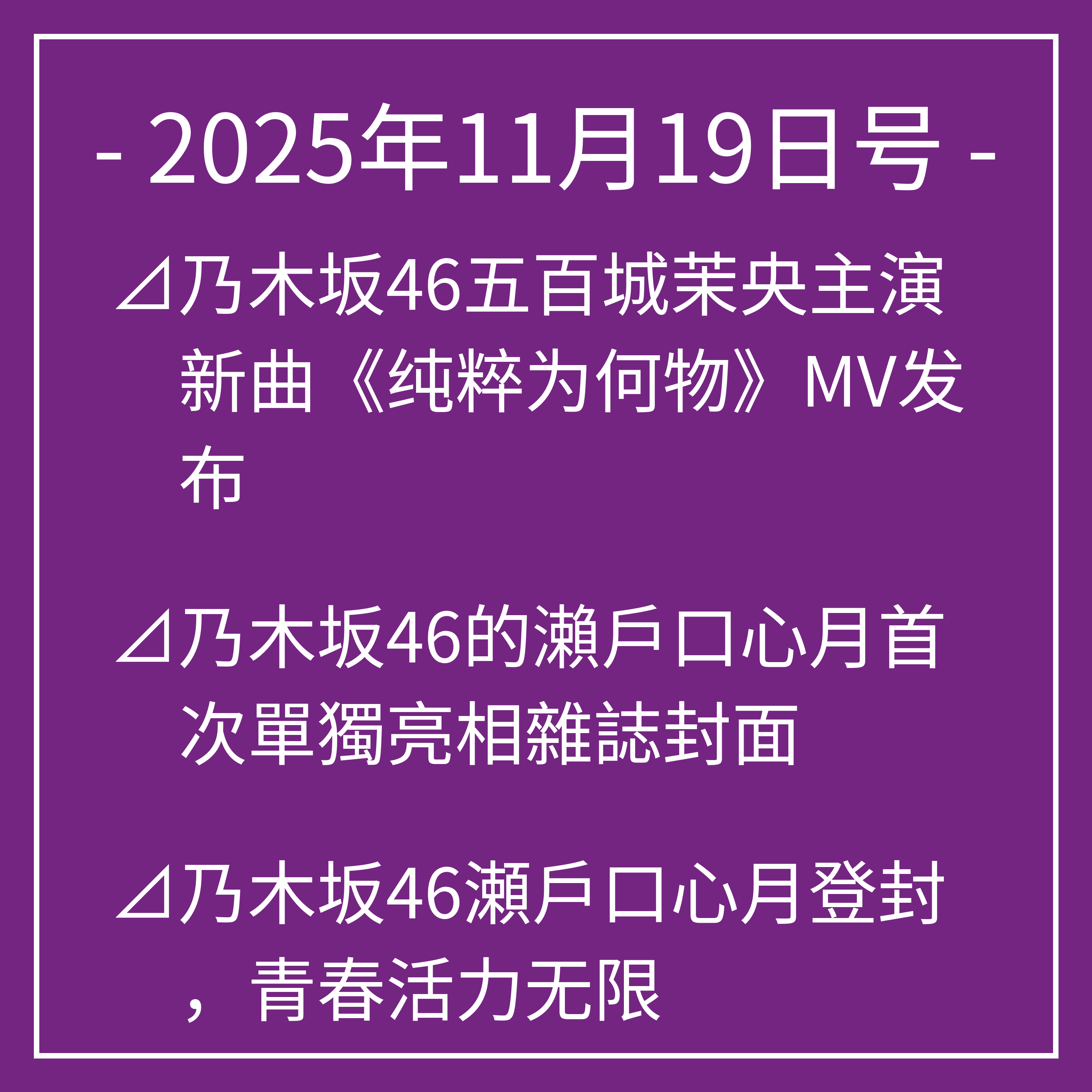 11月19日号⊿乃木坂46五百城茉央主演新曲《纯粹为何物》MV发布⊿乃木坂46的瀨戶口心月首次單獨亮相雜誌封面⊿乃木坂46瀬戶口心月登封,青春活力无限⊿乃木坂46五百城茉央亮相新刊封面⊿乃木坂46久保史绪里即将毕业引发粉丝热议…