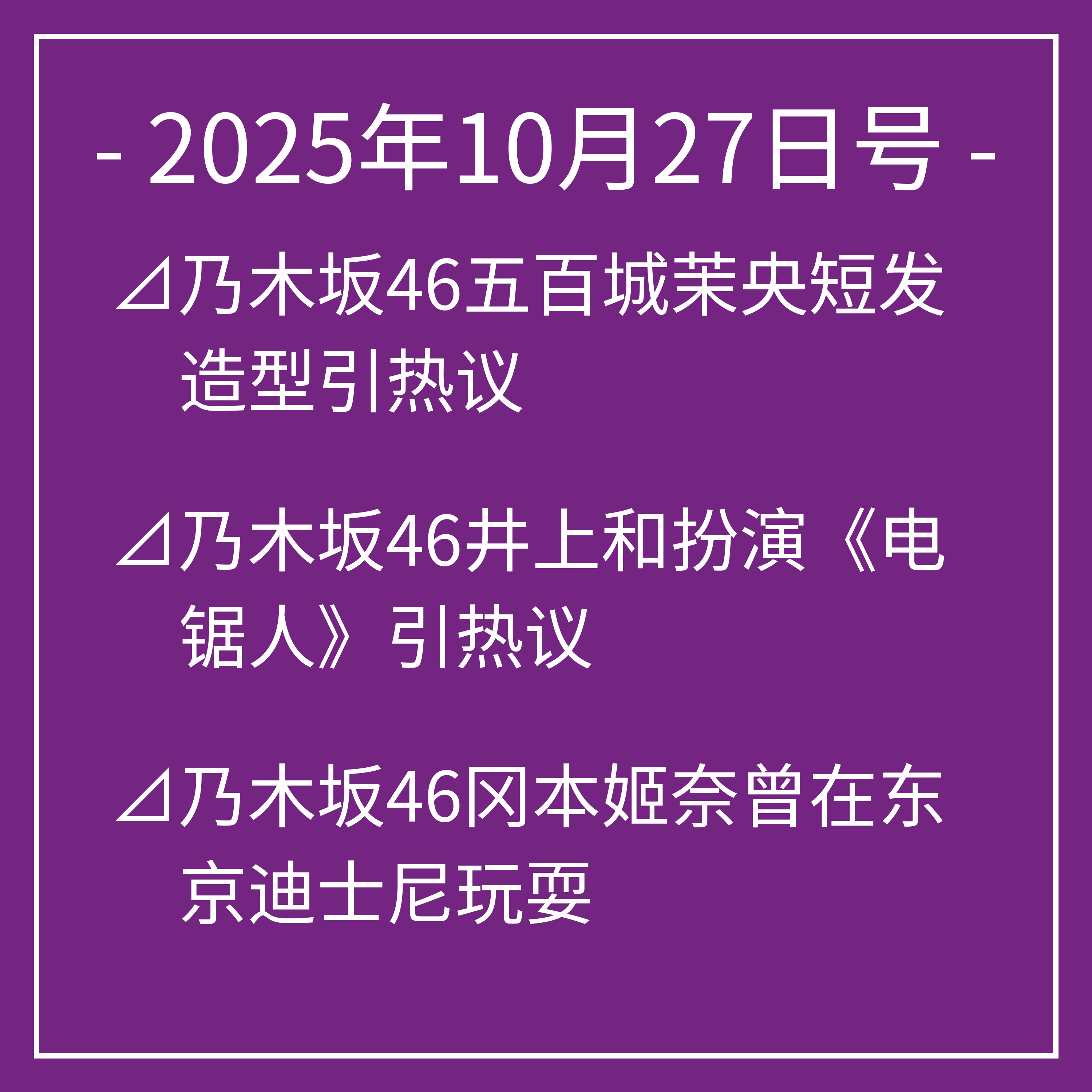 10月27日号⊿乃木坂46五百城茉央短发造型引热议⊿乃木坂46井上和扮演《电锯人》引热议⊿乃木坂46冈本姬奈曾在东京迪士尼玩耍⊿乃木坂46的岩本莲加和富里奈央主演新剧播出⊿乃木坂46白石麻衣与岩本照膝枕甜蜜引关注…