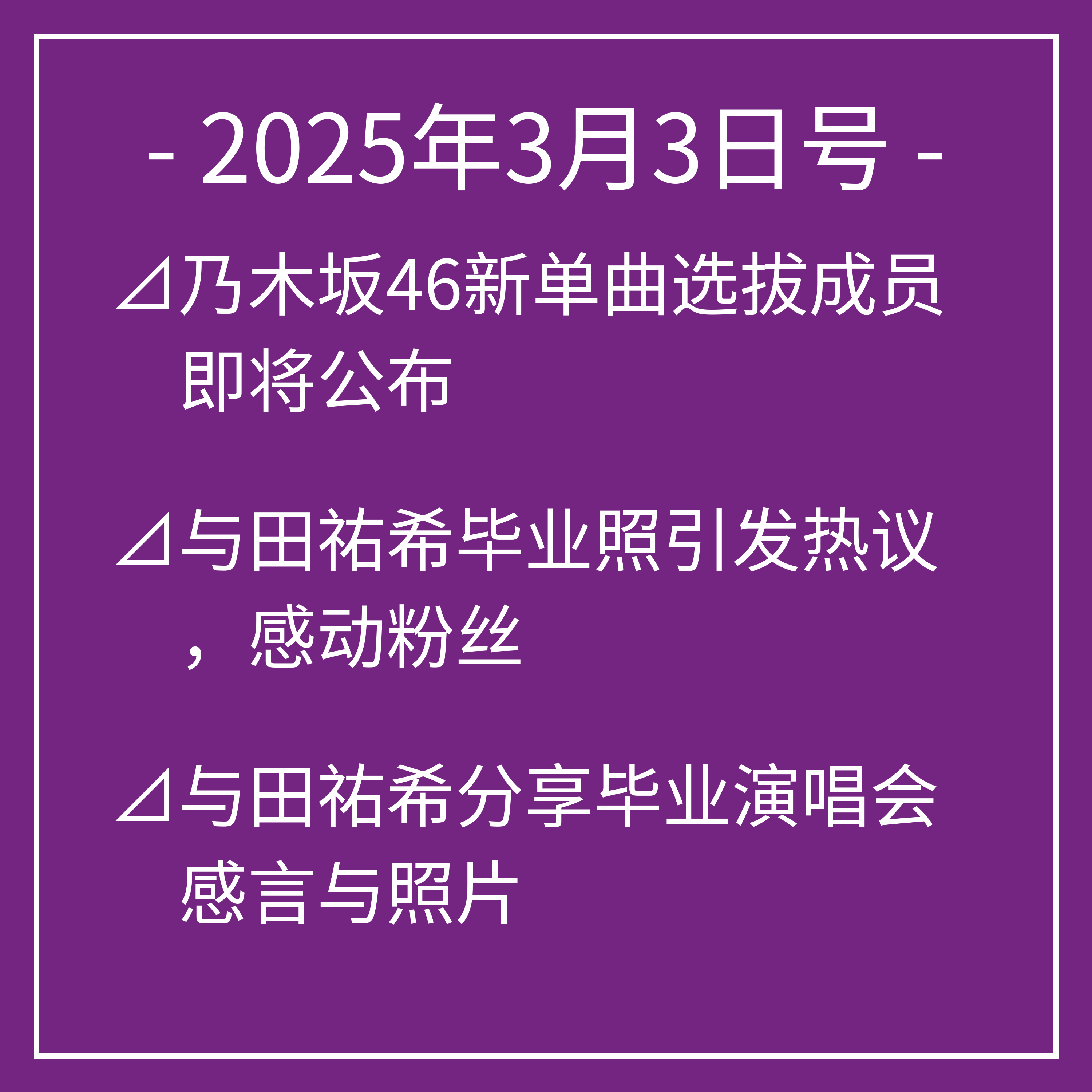 3月3日号⊿乃木坂46新单曲选拔成员即将公布⊿与田祐希毕业照引发热议,感动粉丝⊿与田祐希分享毕业演唱会感言与照片⊿乃木坂46久保史绪里谈月的缘分与成长⊿乃木坂46久保史绪里分享舞台背后的成长故事⊿元乃木坂46加藤史帆晒出华丽时尚搭配…