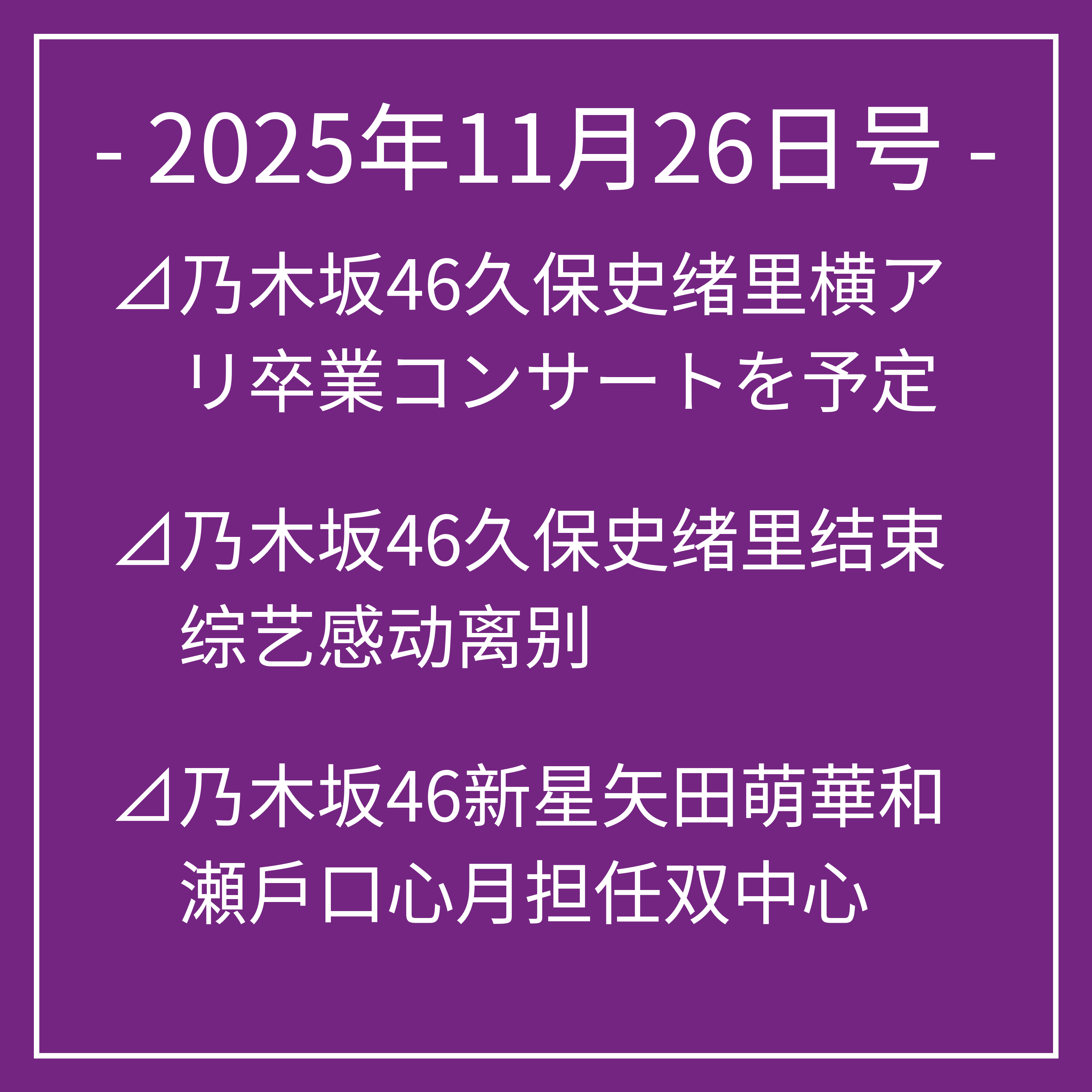 11月27日号⊿乃木坂46新曲《ビリヤニ》在北京引发热潮⊿乃木坂46新センター6期生成长引关注⊿乃木坂46久保史绪里即将毕业 曾为团队核心成员⊿乃木坂46久保史绪里最后演出 感动粉丝⊿乃木坂46与田祐希等亮相《bis》冬号封面…
