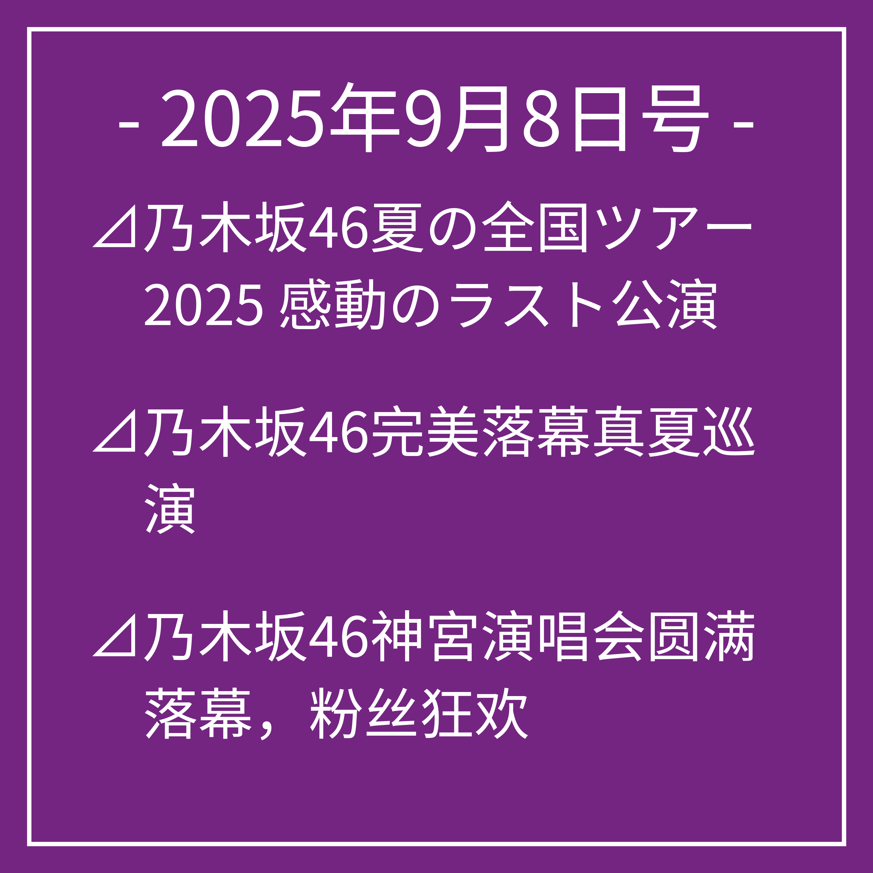9月8日号⊿乃木坂46夏の全国ツアー2025 感動のラスト公演⊿乃木坂46完美落幕真夏巡演⊿乃木坂46神宮演唱会圆满落幕,粉丝狂欢⊿乃木坂46的与田祐希换新发型引热议⊿乃木坂46秋元真夏发布“穿冬服”照片引热议…