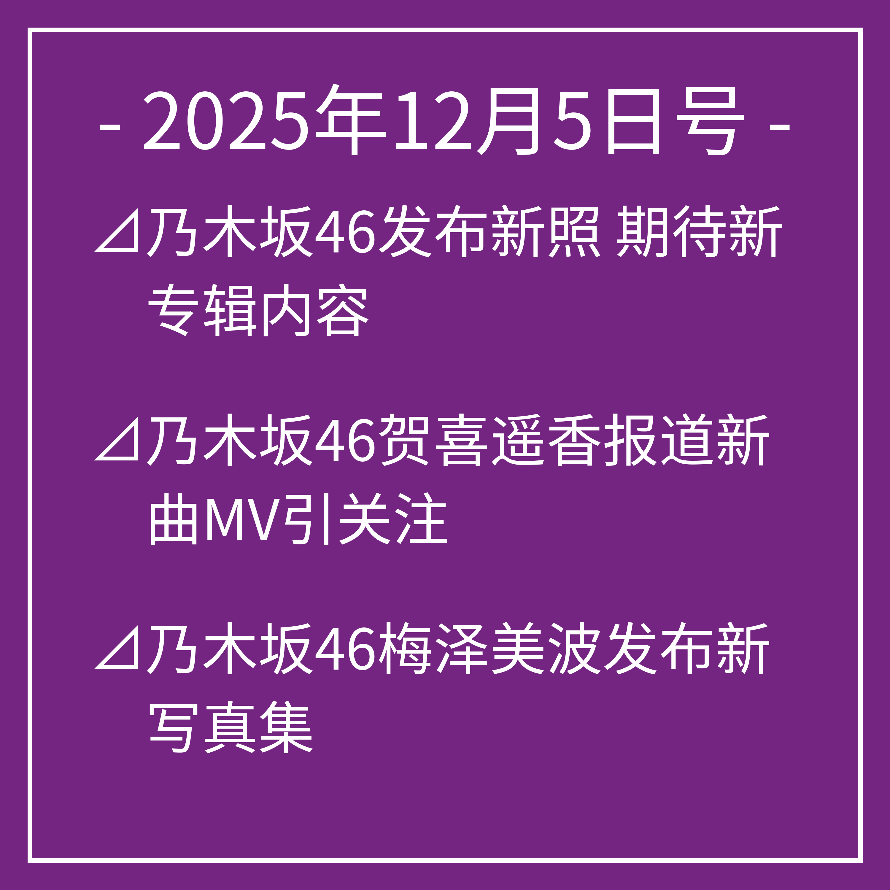 12月5日号⊿乃木坂46发布新照 期待新专辑内容⊿乃木坂46贺喜遥香报道新曲MV引关注⊿乃木坂46梅泽美波发布新写真集⊿乃木坂46井上和首次亮相北京普通话主播引关注⊿乃木坂46松村沙友理宣布结婚生子引关注…