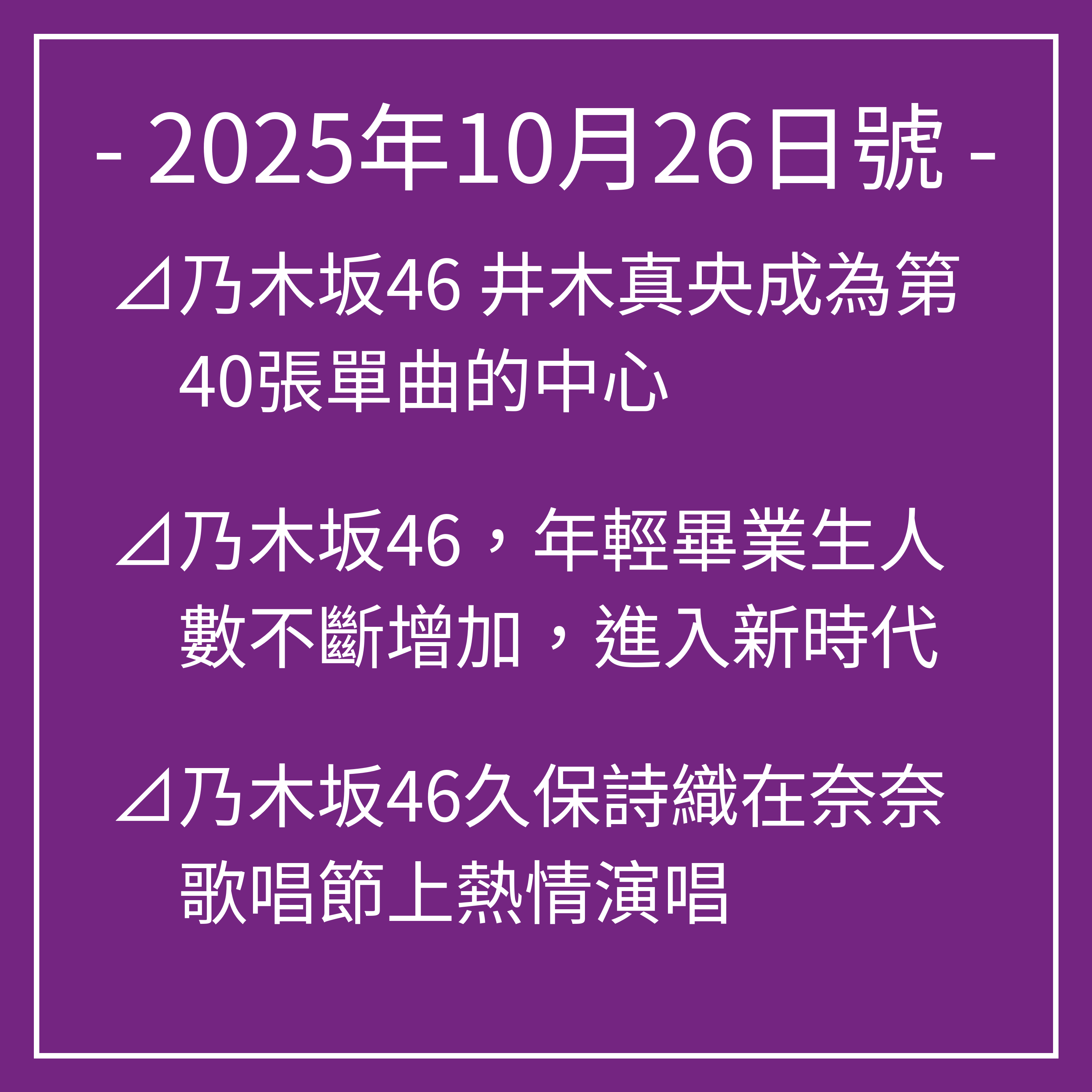 消息快訊乃木坂46宣佈將在2025年12月19日至21日