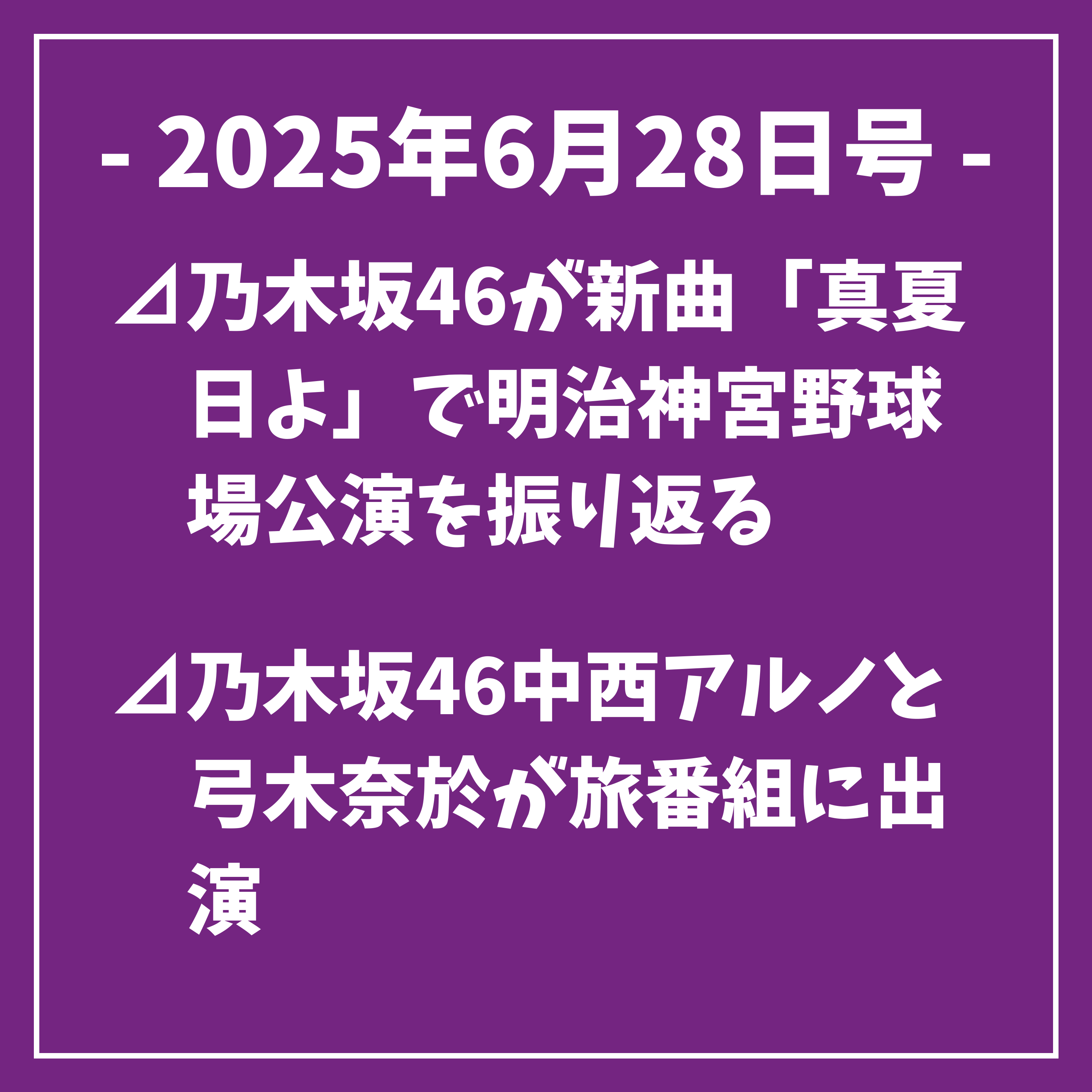 続いて、本日6月28日の乃木坂46に関するスケジュールをお伝えします。