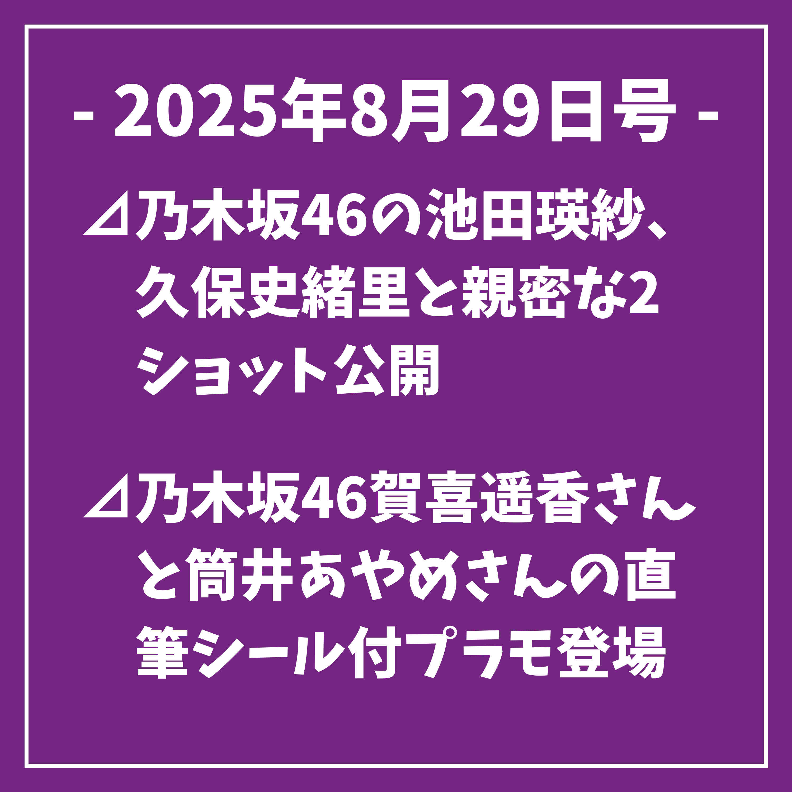乃木坂46の池田テレサちゃん、久保詩織ちゃんと親密なツーショット公開⊿乃木坂46の池田テレサちゃんがインスタグラムに久保詩織ちゃんとのお揃いの髪型のツーショットを投稿しました。音楽番組、WITH MUSIC出演時のオフショットで黒髪パッツンストレートの姿や笑顔の写真を披露し、仲の良さを伺わせています。