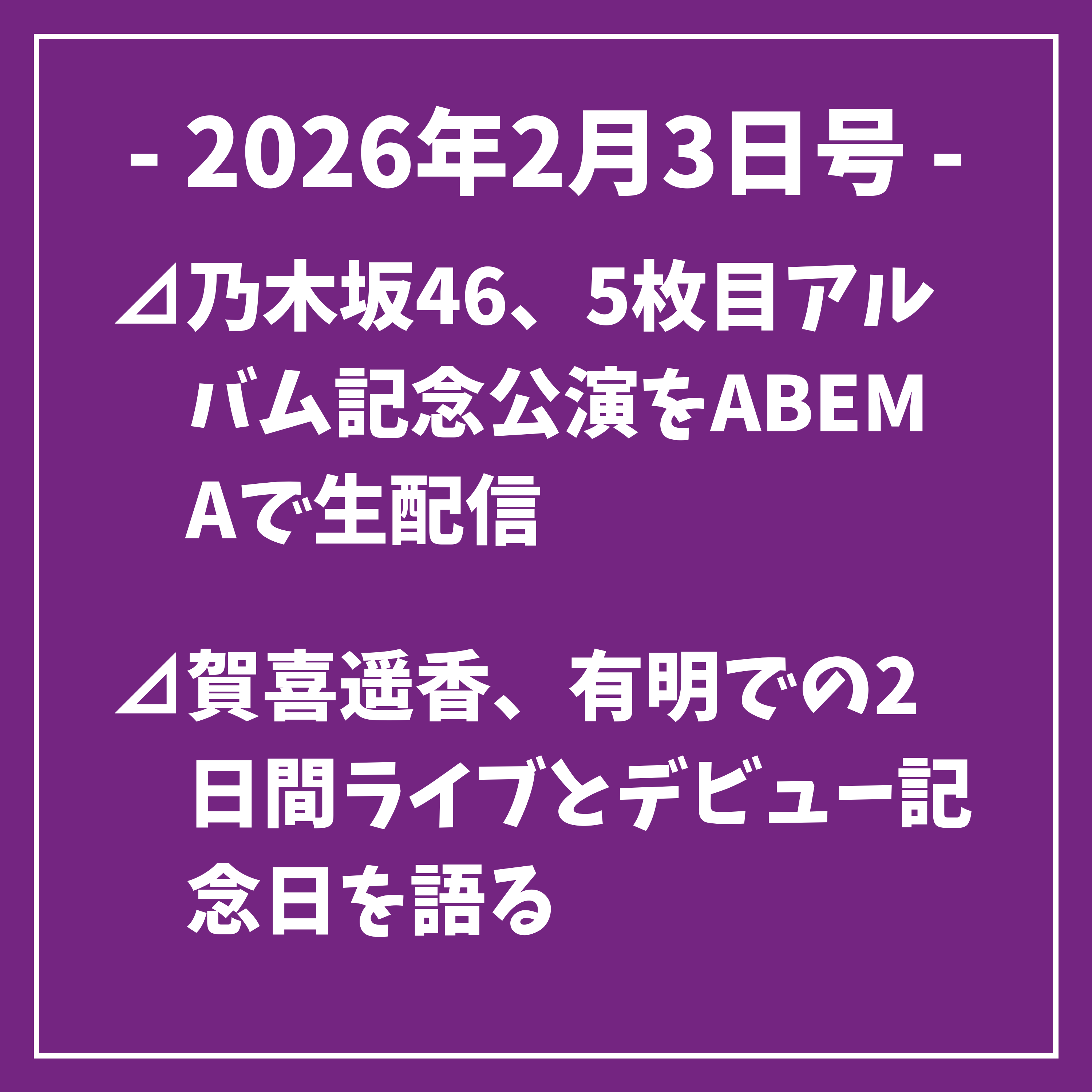 以上、本日の乃木坂46に関するトップニュースをお届けしました。その他のニュースは番組の後半でお伝えします。続いて、本日2月3日の乃木坂46に関するスケジュールをお伝えします。