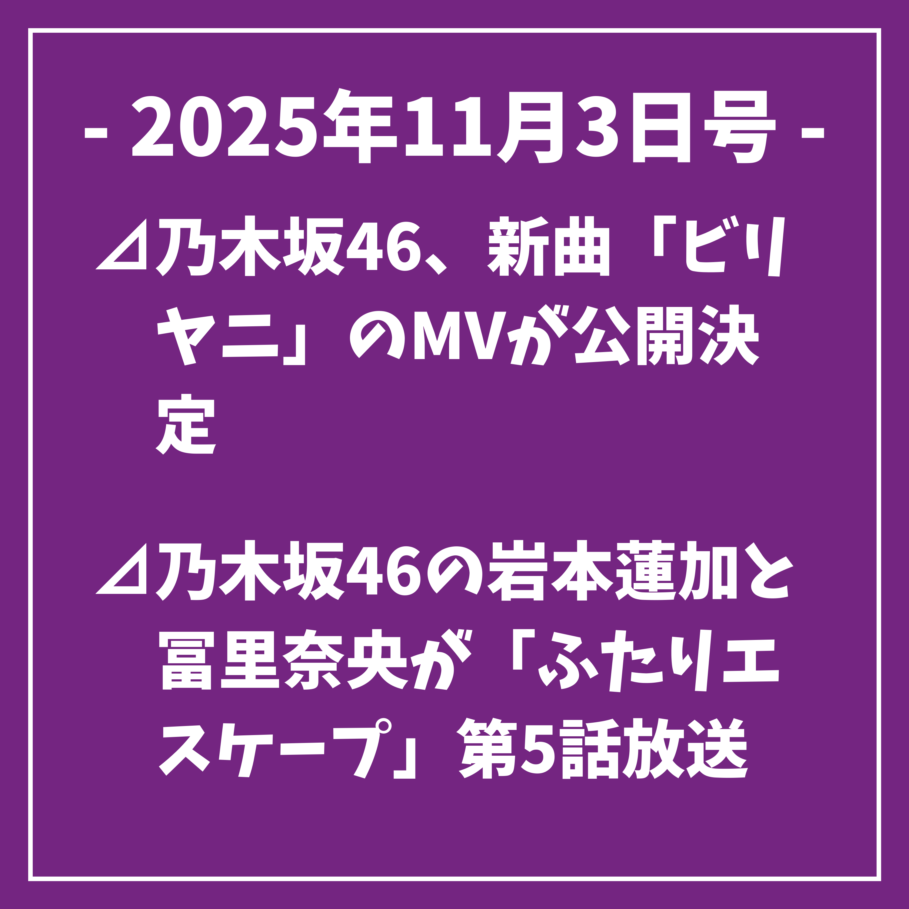 乃木坂46に関するニュースやメディア情報、重大発表、ブログの更新情報などを毎日お届けする、世界初の乃木坂46専門のニュース番組です。