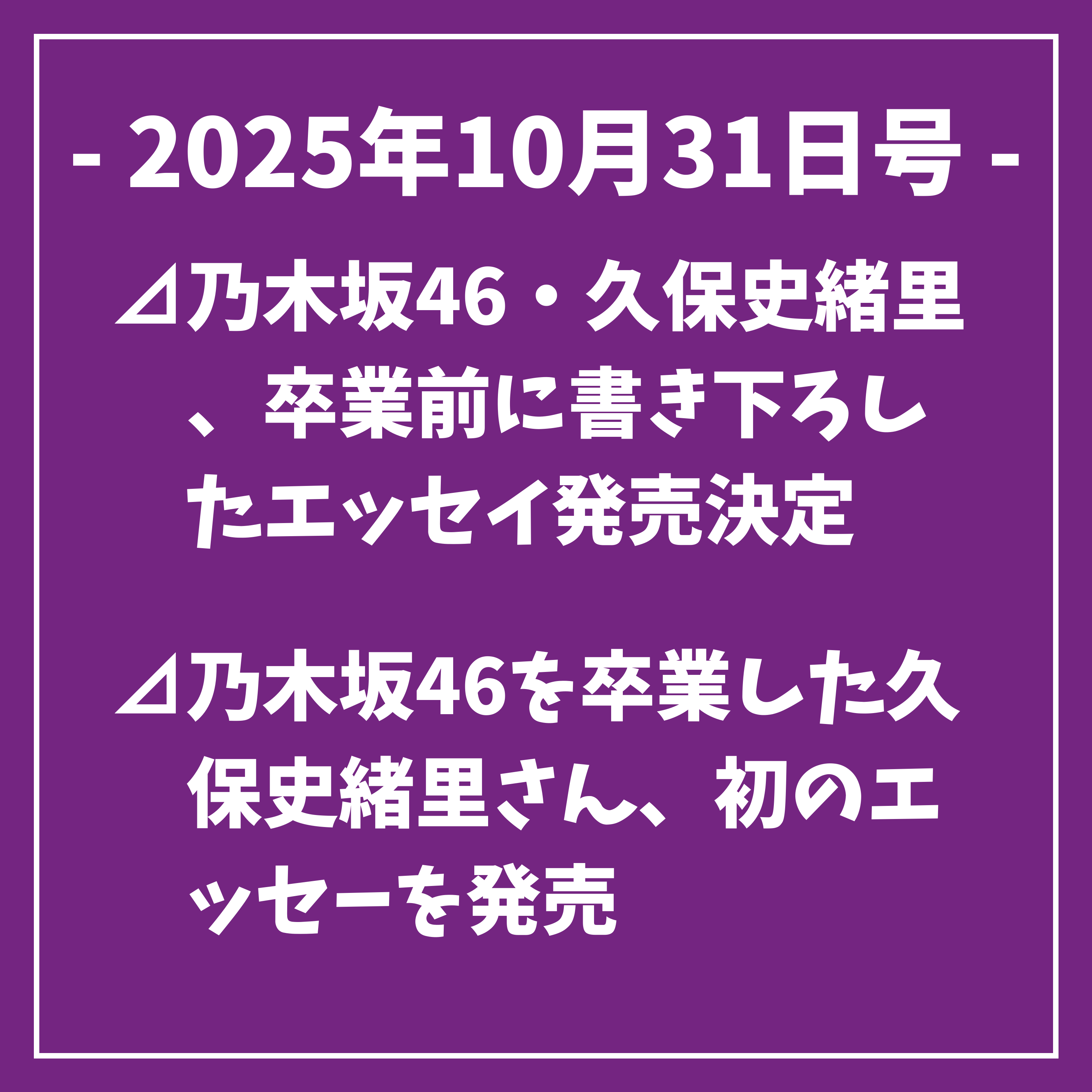 乃木坂46を卒業した久保史緒里ちゃん、初のエッセイを発売⊿乃木坂46を11月に卒業した久保史緒里ちゃんが12月16日に初のエッセイ、ロストレターを発売しました。