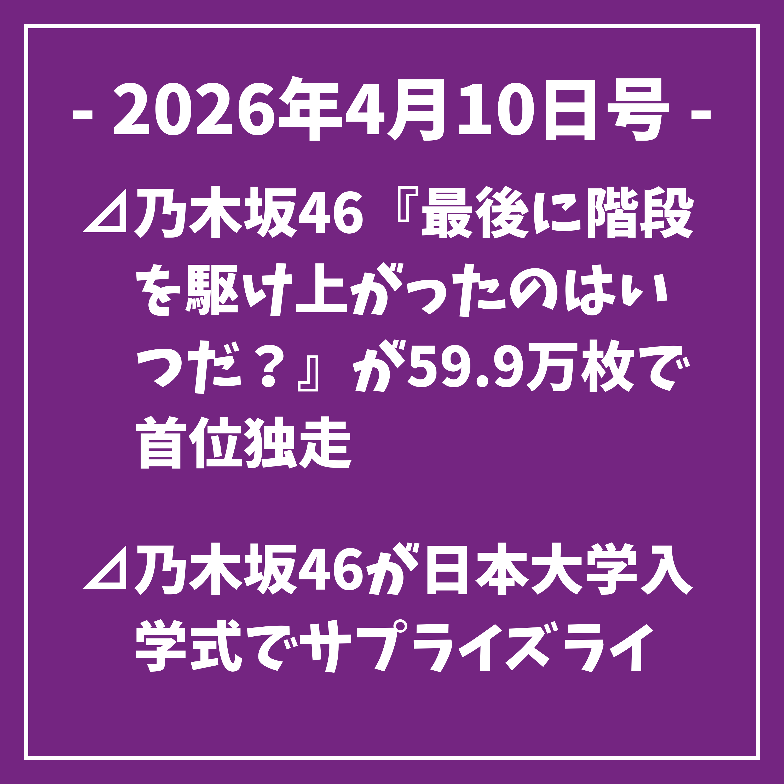 乃木坂46の最新シングル最後に階段を駆け上がったのはいつだ?が4月6日から8日の集計で59万9691枚を売り上げ、首位を独走しています。