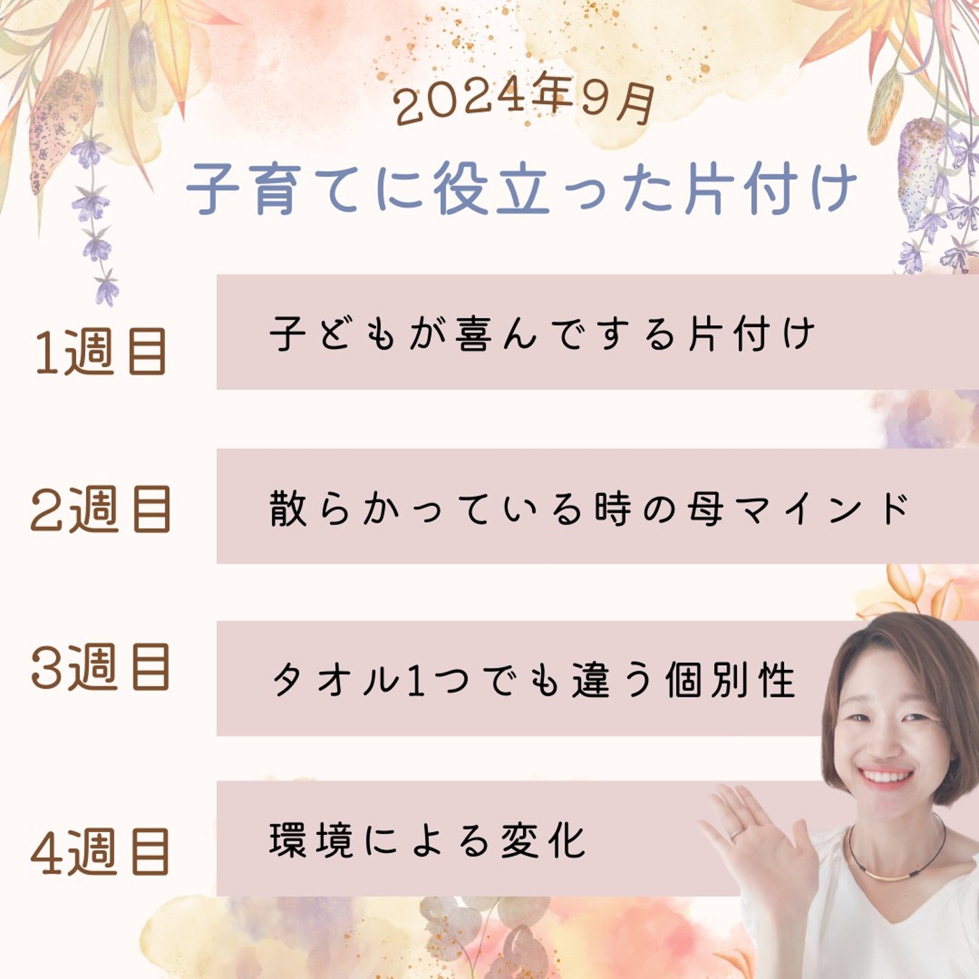 1週目は子どもが喜んでする片付け、2週目は散らかっている時の母マインド、3週目今週はですねタオル一つでも違う個別性ということでお話ししておりますね。