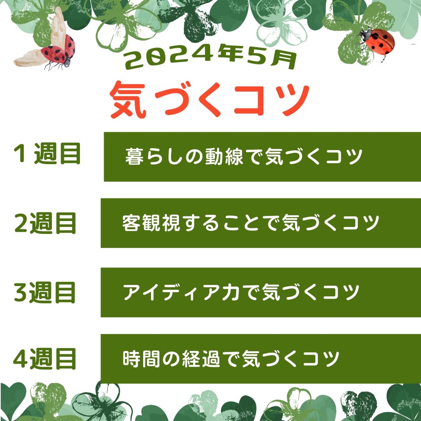はい、今月のテーマといたしましては、気づくコツということでお話ししております。1週目は暮らしの動線で気づくコツ、2週目は客観視することで気づくコツについて話しております。