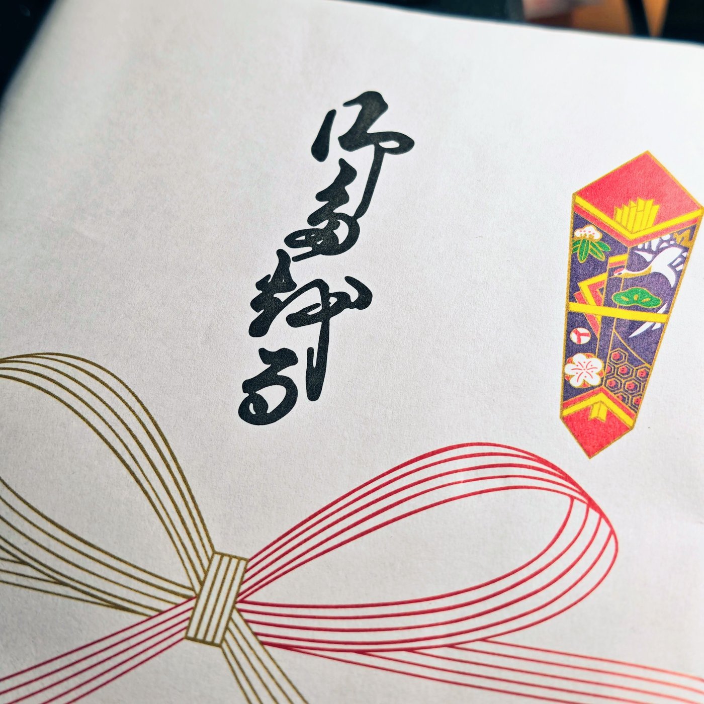 熨斗(のし=わたしゃ読めるが書けません)が巻いてあって、そこにプリントでなんか書いてある。