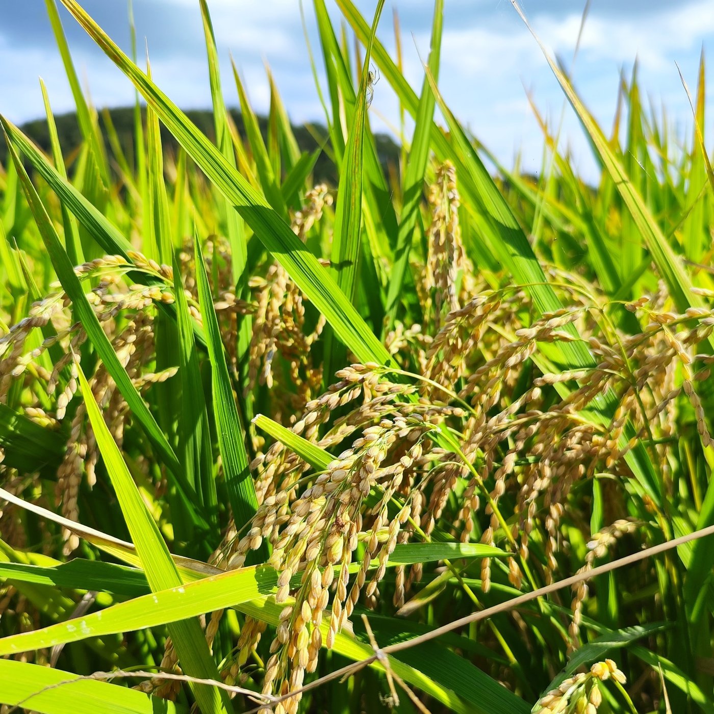 地平線まで黄色と緑の稲穂の田んぼ、空は青と白。
