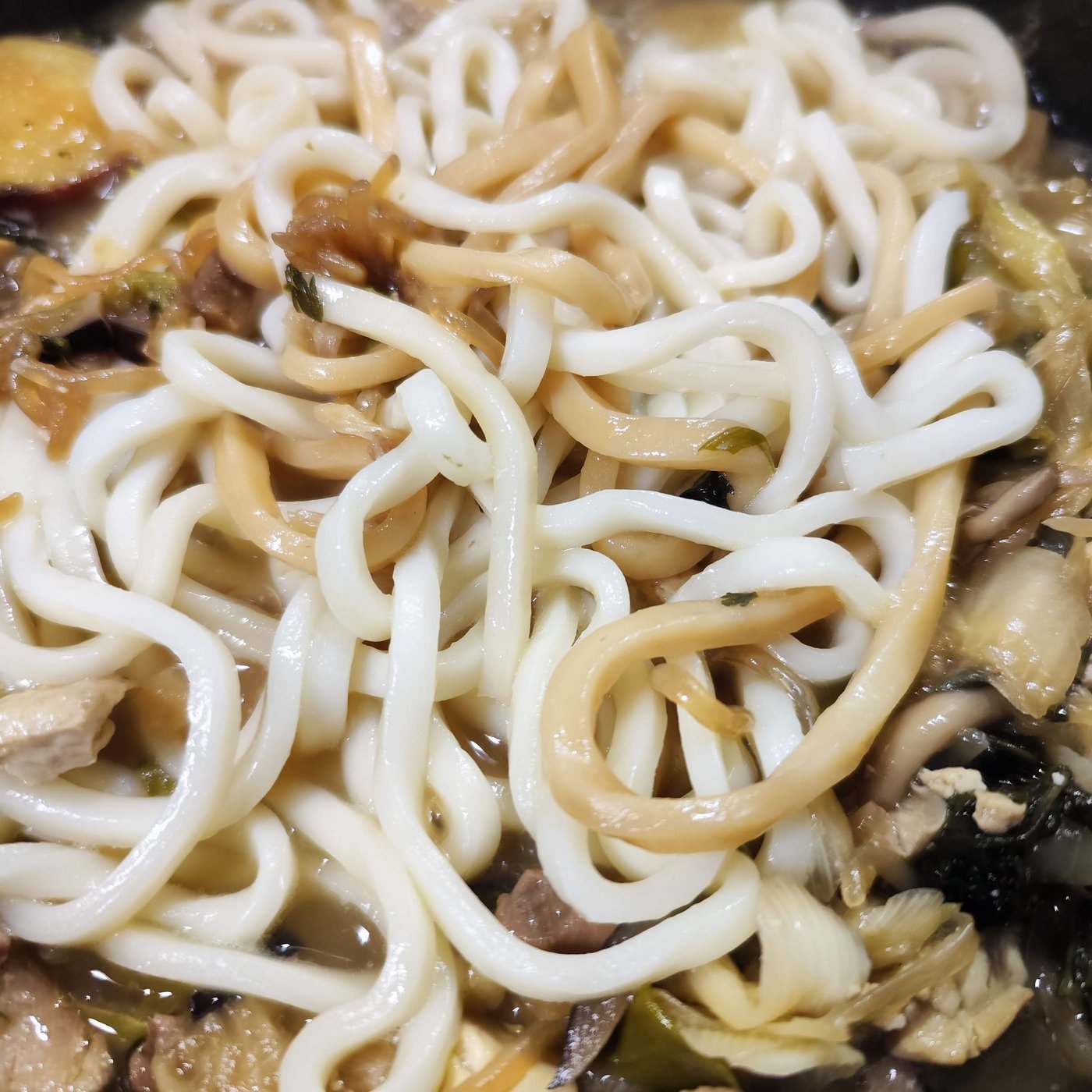 しばらくすると、紅白ならぬ、白黒うどんが完成し、すき焼きの目的達成となります。