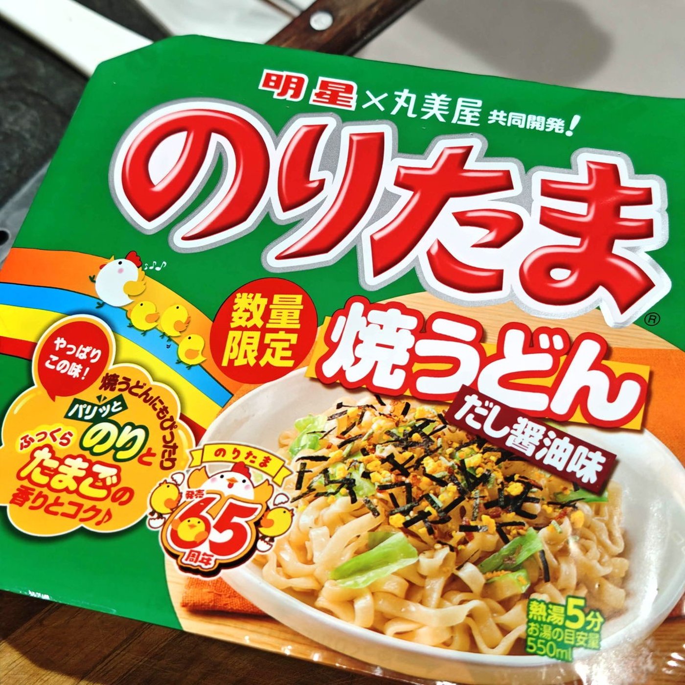 そして、ついスーパーで手に取った「明星 ✕ 丸美屋 のりたま焼きうどん(数量限定)」には、のりたま65周年!と書いてあり、これまたほぉ~と関心しちゃいました。