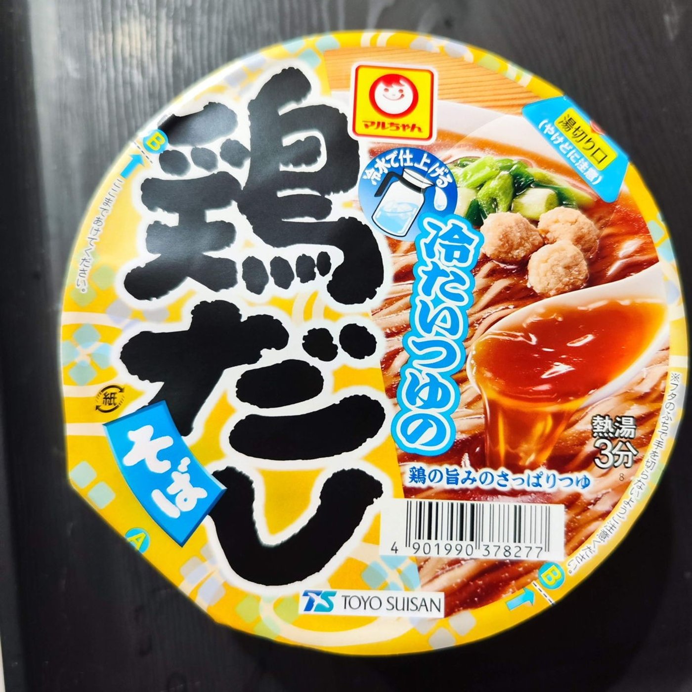 まるちゃん、冷たいつゆの冷水で仕上げる鶏出汁そば。