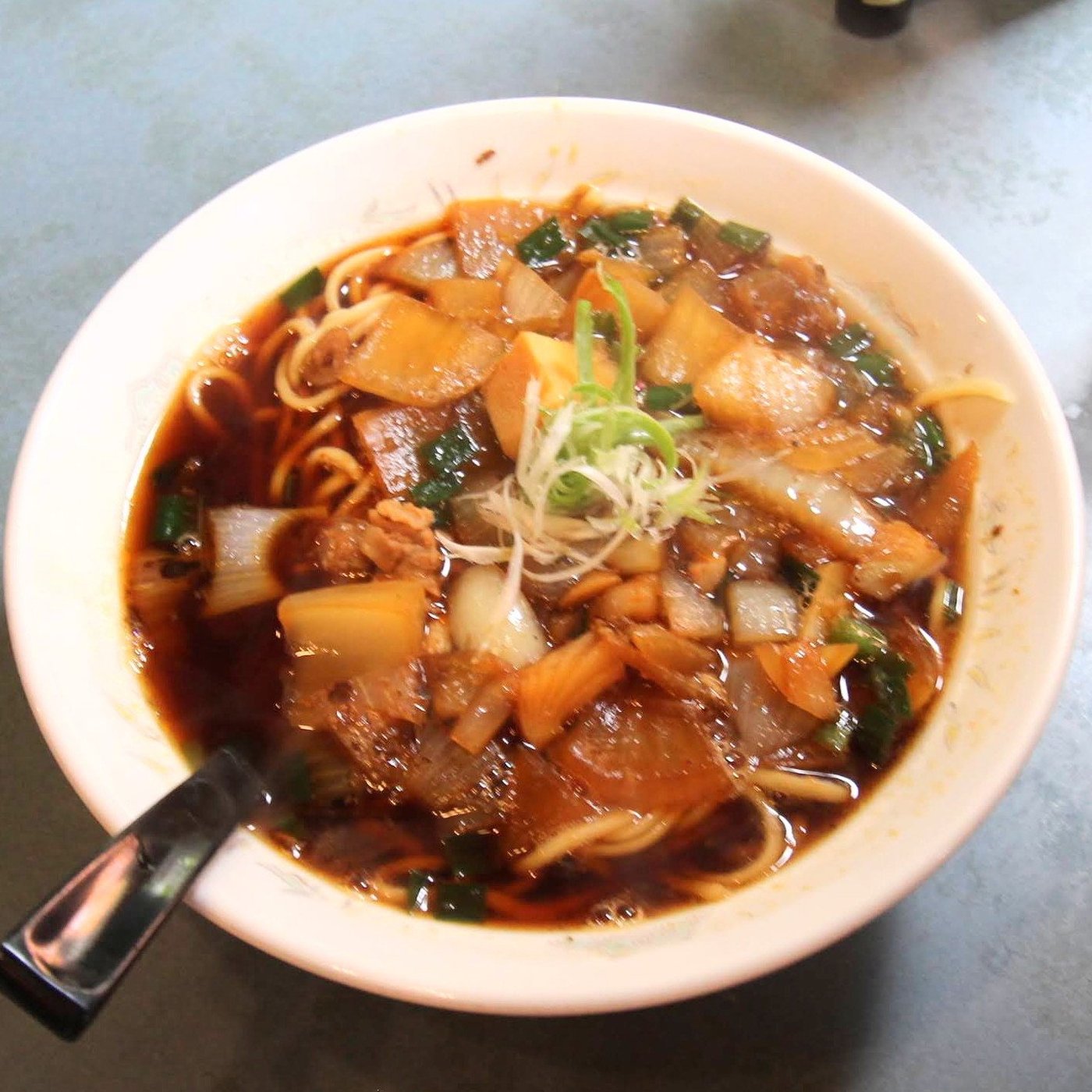 玉ねぎ・ニンニク・豚肉・唐辛子・ニラ・ネギ系の濃いめの醤油色スープです。