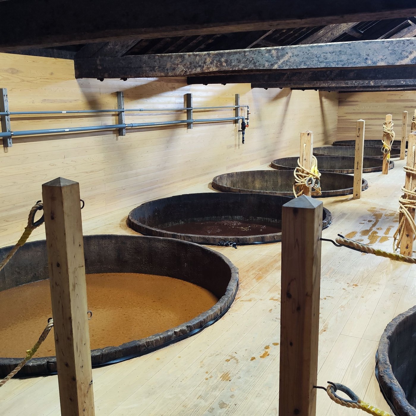 醤油を仕込んでいるこの現場。ドアを開けて入った瞬間に、もうお醤油のすごい良い匂い。たまりませんね、こりゃ。