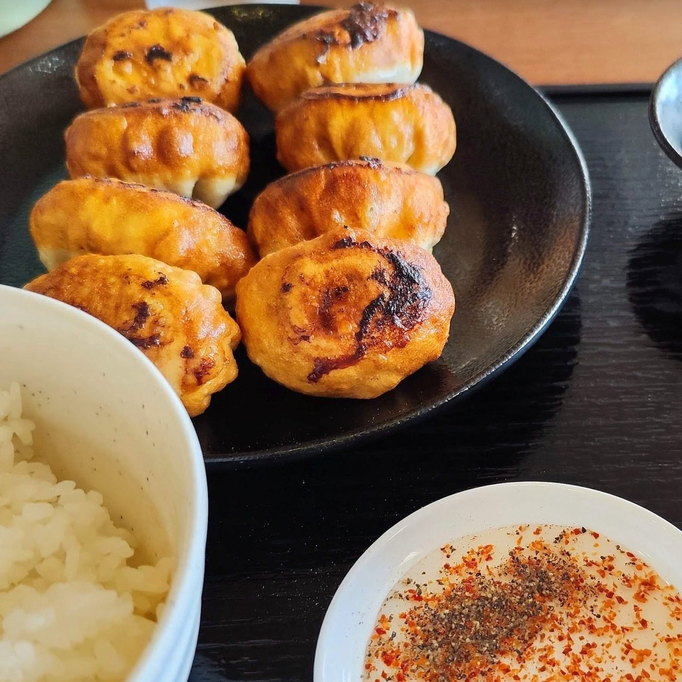 ったくなんちゅー食べ方してんねん?!と思われてるでしょうけど、いやまぁ日本式に焼き餃子に白ご飯でしょ!って感じ。