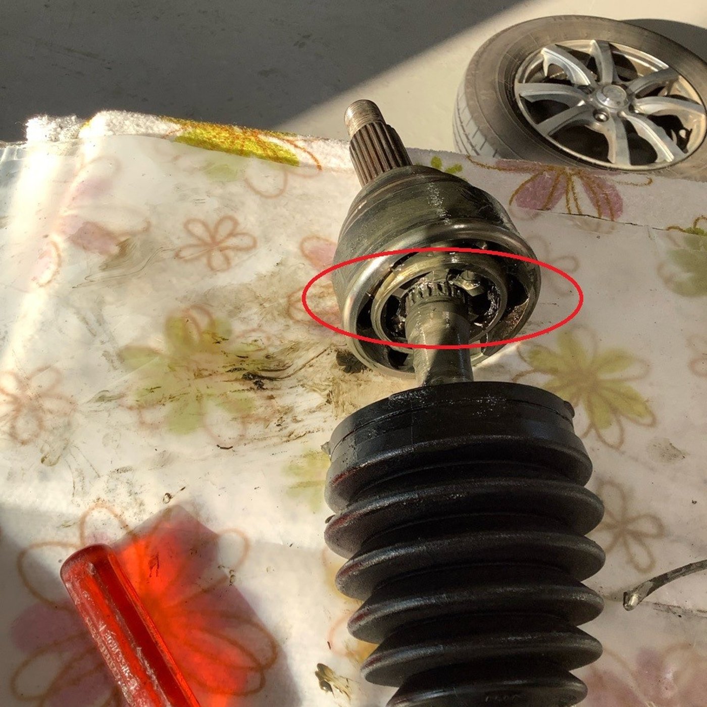 FFのエンジンからタイヤに動力を伝えるドライブシャフト、その先に有るアウタージョイントがぶっ壊れてました。