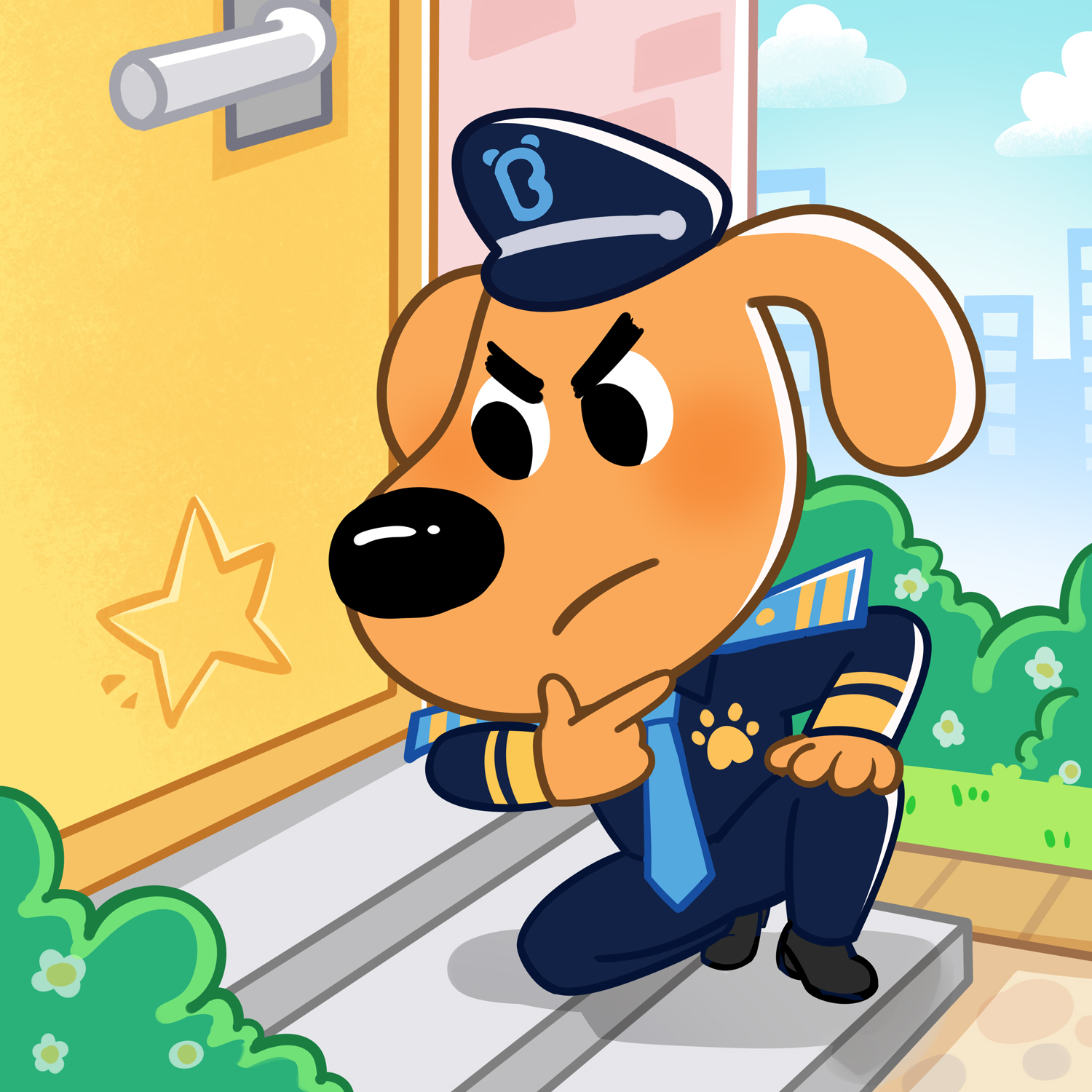 夜になり、ビロード通りの住人たちが眠りについた頃、怪しい人影が、ある家の前にやってきました。ドアの隅に描かれた小さな星を確認すると、排水管を軽々と登っていきます。