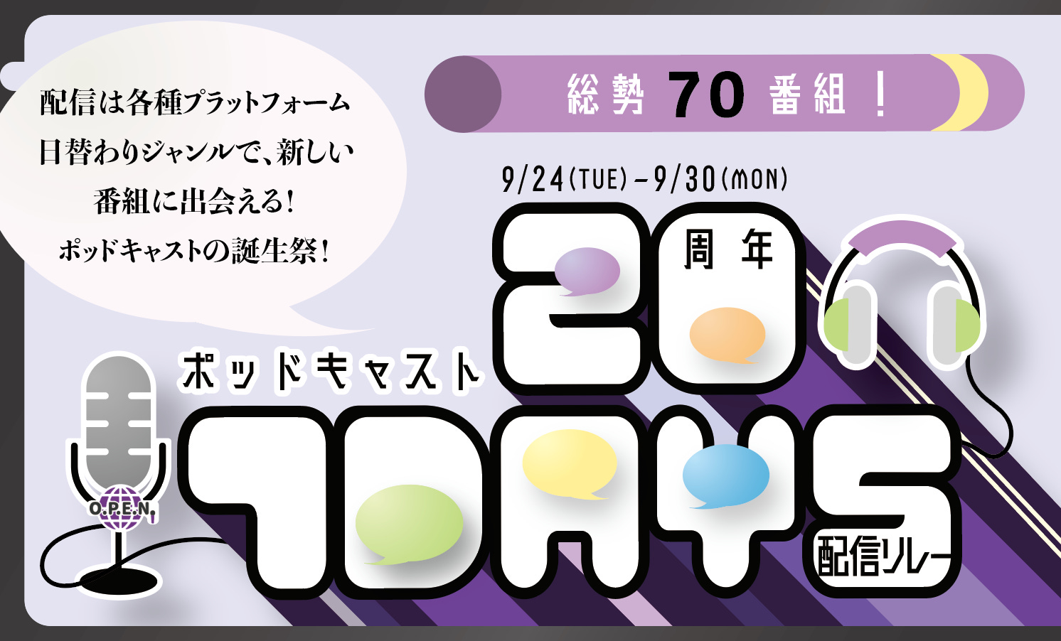 このウィークリレコメントのシリーズが終わりますと、9月24日からポッドキャスト20周年、セブンデイズ配信リレーという目玉企画が待っております。