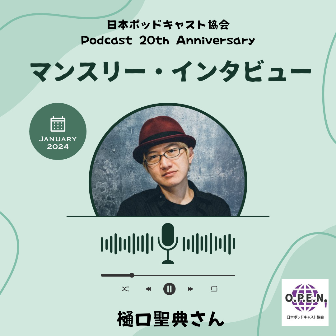 ということで、日本ポッドキャスト協会のポッドキャストですけども、今年2024年の9月30日がまたポッドキャストでありますけども、9月、ポッドキャスト自体が誕生して20周年ということで、日本ポッドキャスト協会では1月から7月までマンスリーでインタビューをしていこうという企画になっております。