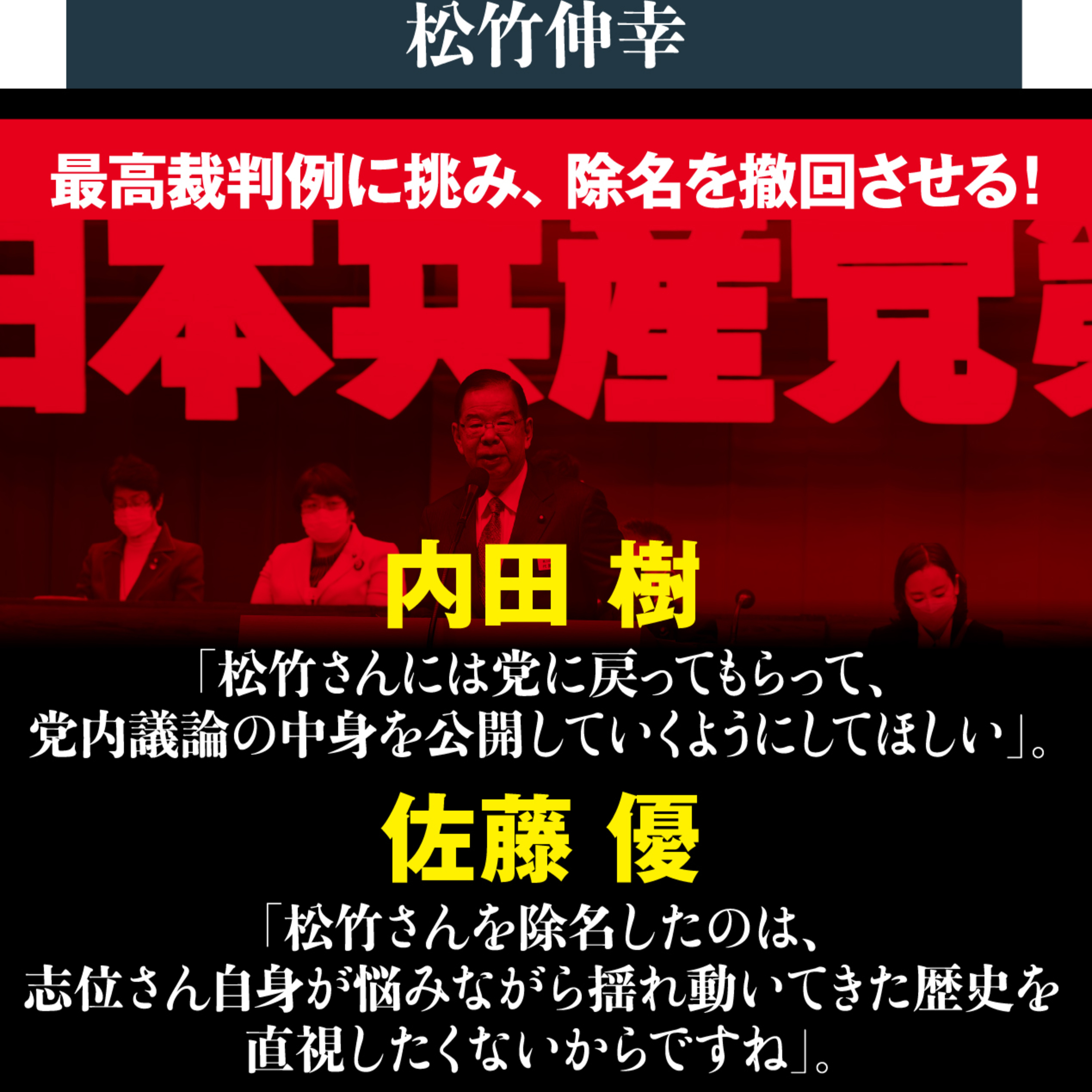 政治不信が渦巻く中、期待を寄せたくなるのが〝正しい主張〟を掲げる日本共産党です。金権政治撲滅、反戦平和、庶民の生活の味方……。松竹伸幸さんは党員として長年活動してきました。2022年秋、党がより多くの人々の支持を得るためには「党首公選制」など大胆な改革を導入すべきだという提言を『シン・日本共産党宣言』(文春新書)にまとめます。安全保障政策も見直し、「左側の自民党」になろう、政権に近づくためには国民に親しみやすい開かれた組織にしようという松竹さんの提言は、大きな反響を呼びました。ところが、党の対応は恐るべきものでした。『赤旗』で松竹さんを「党かく乱者」「党破壊者」と罵倒し、「規約違反」として調査。そしてついに除名されてしまったのです。松竹さんは不当な除名処分を撤回させるべく、東京地裁に提訴。『私は共産党員だ! シン・日本共産党宣言Ⅱ』ではその内幕を全て明かしました。これからの闘いに向けた決意を、著者自らが語ります。