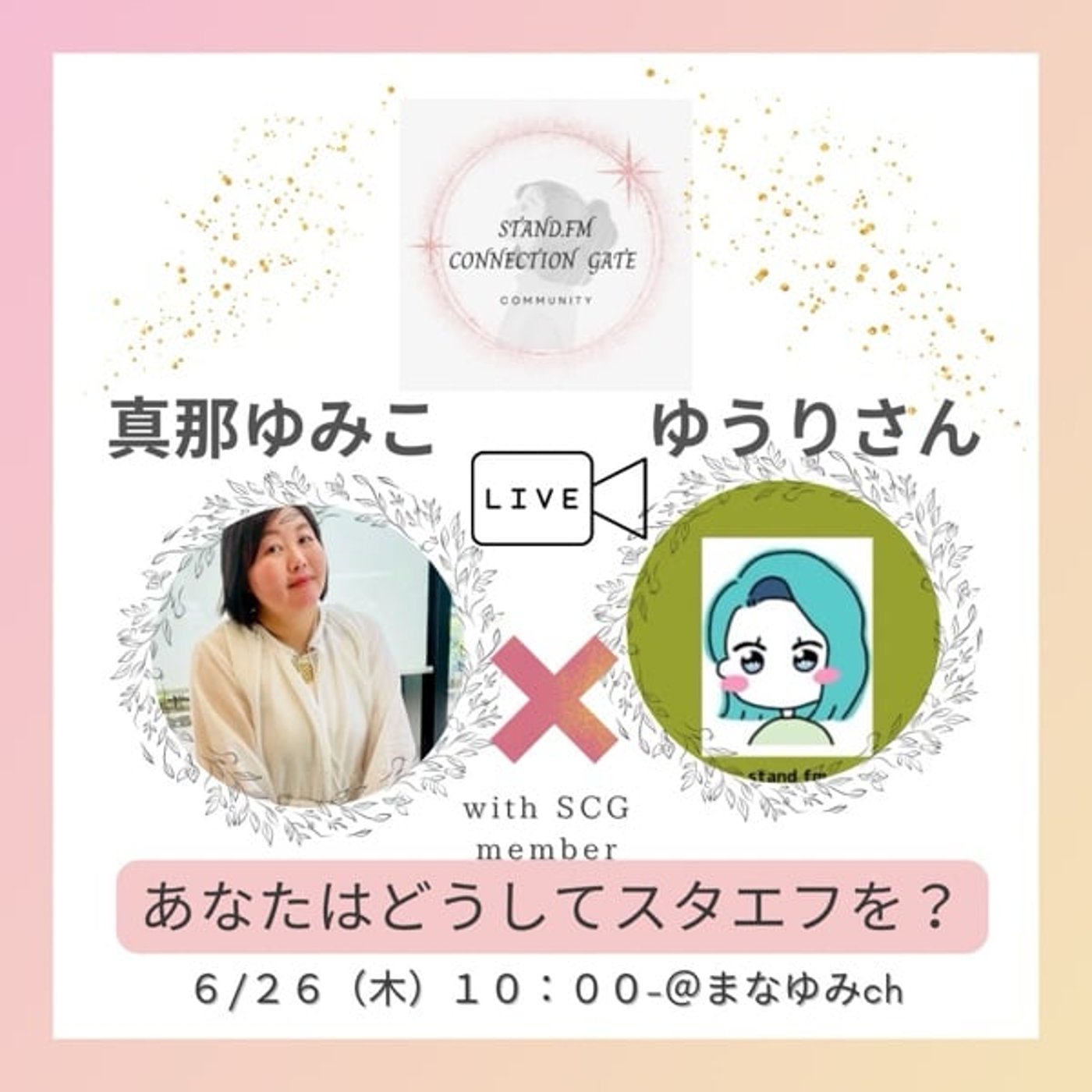 こちらはですね、私が今所属させていただいている片岡住良さん主催のコミュニティSCG、スタエフを通して大人が本気で夢を叶えるために行動していくコミュニティのメンバーさん、約20名の皆さんにスタエフについての思いを伺っていくという企画になっております。