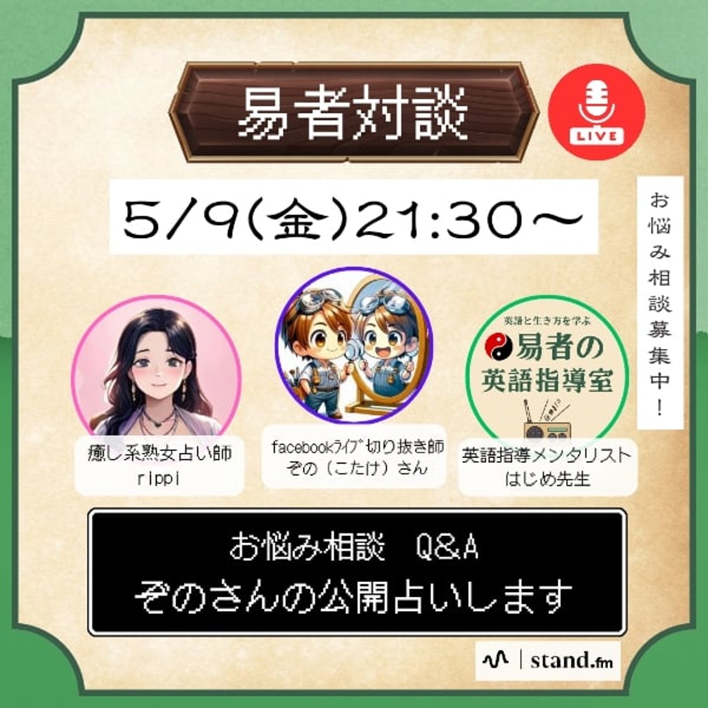 はい。私はこのはじめ先生と、易者対談っていうのを一回やったら、公開占いしたいねっていう話になって、やってくださいみたいな人が現れて、そこからやりたいやりたいっていう人が続いていって、今第10弾目というぞのさんがやってる感じでね、継続的に易者対談をやっている関係とかね、なんですね。