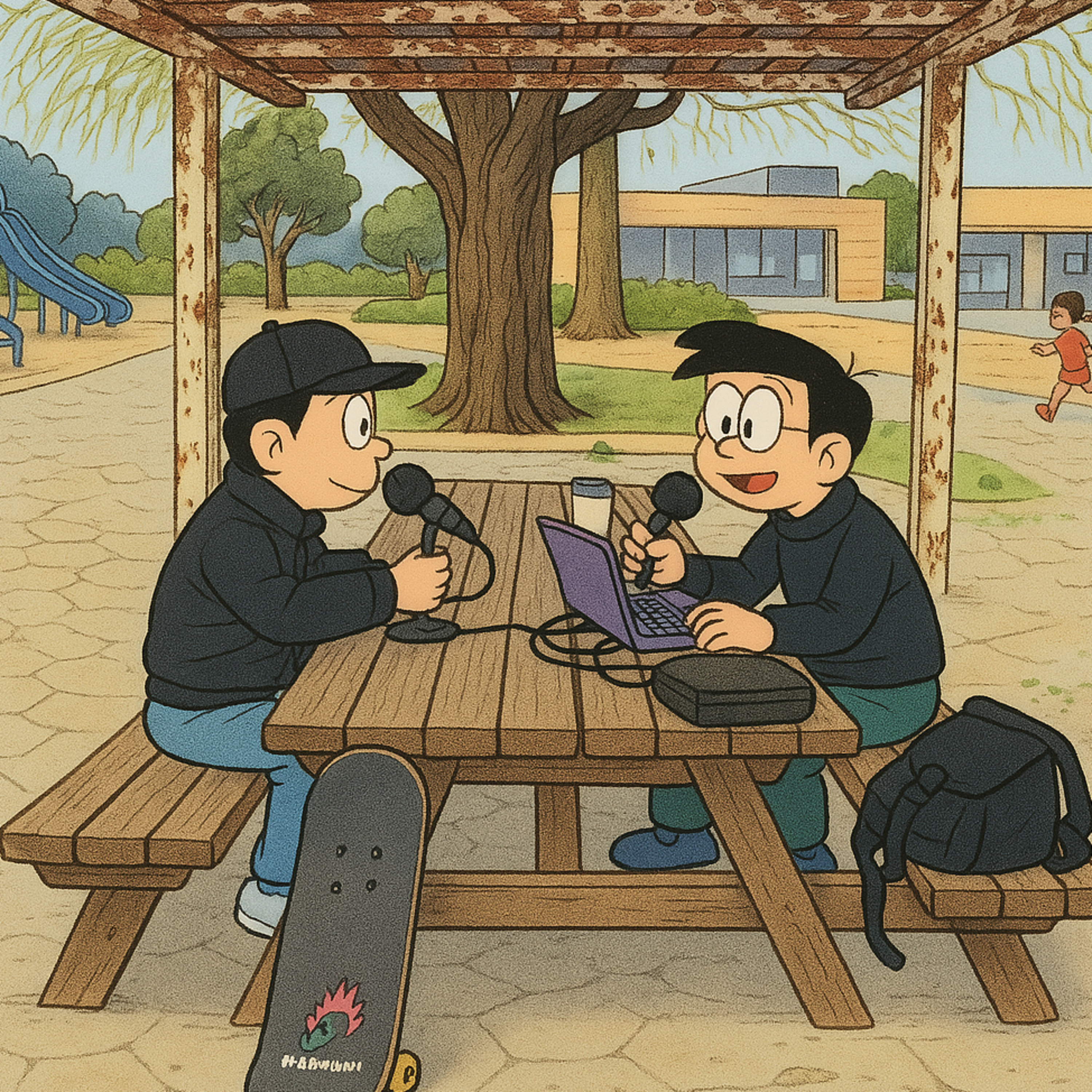 スタンド忘れて、今、コヘイ、マイク、スケボー2段積みのバッグに、