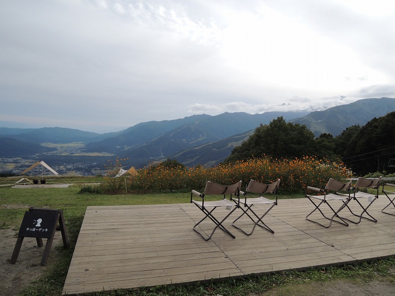 眼前の白馬三山を眺めながらコーヒーなど楽しめる展望テラス。マウンテンハーバーと名付けられたテラスのせり出し部分は撮影スポットです。