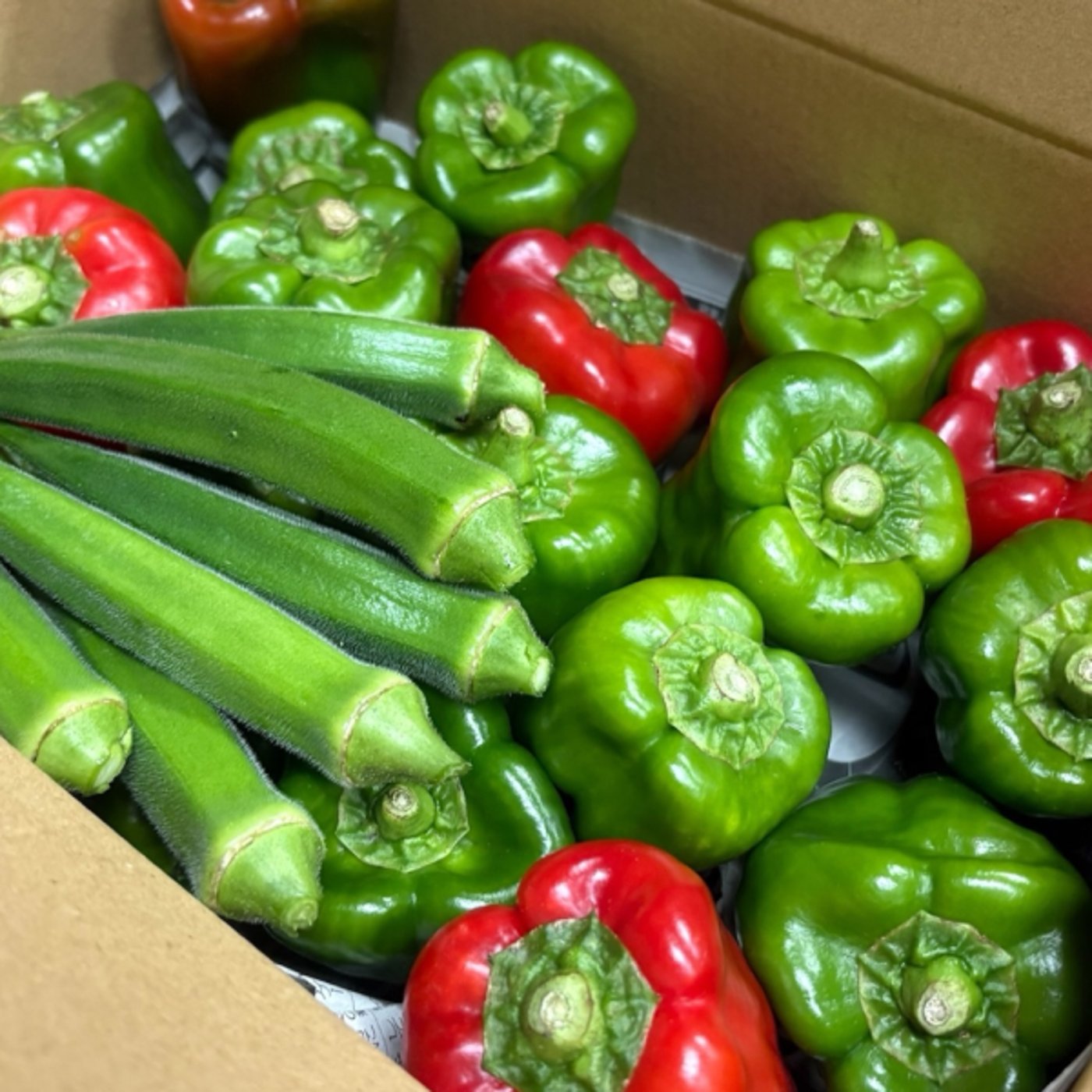 で、これあの今写真に写ってるのがピーマンは無農薬で、赤と青のピーマン2種類の色と、あとオクラが6本ぐらいって感じで販売する予定です。