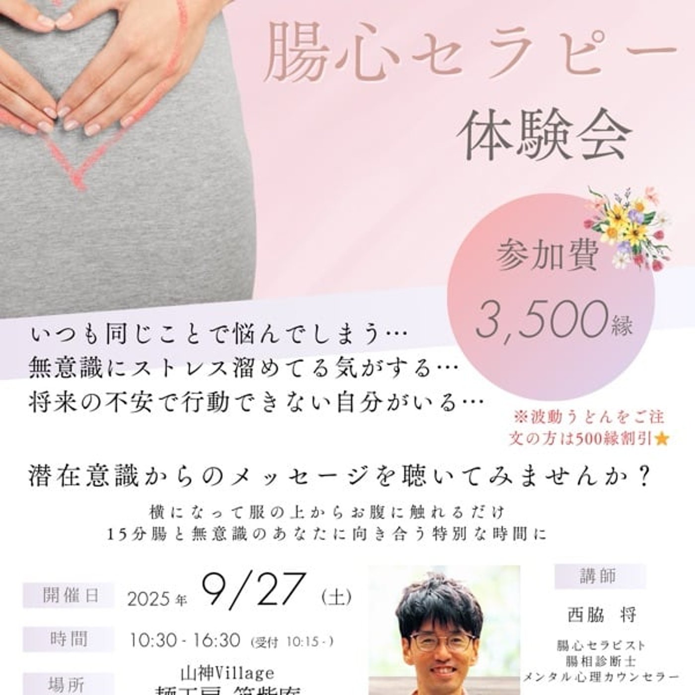 なので、こういう波動うどんを食べた方は、500円引きで3000円で受けられますというふうな設定にさせていただいています。
