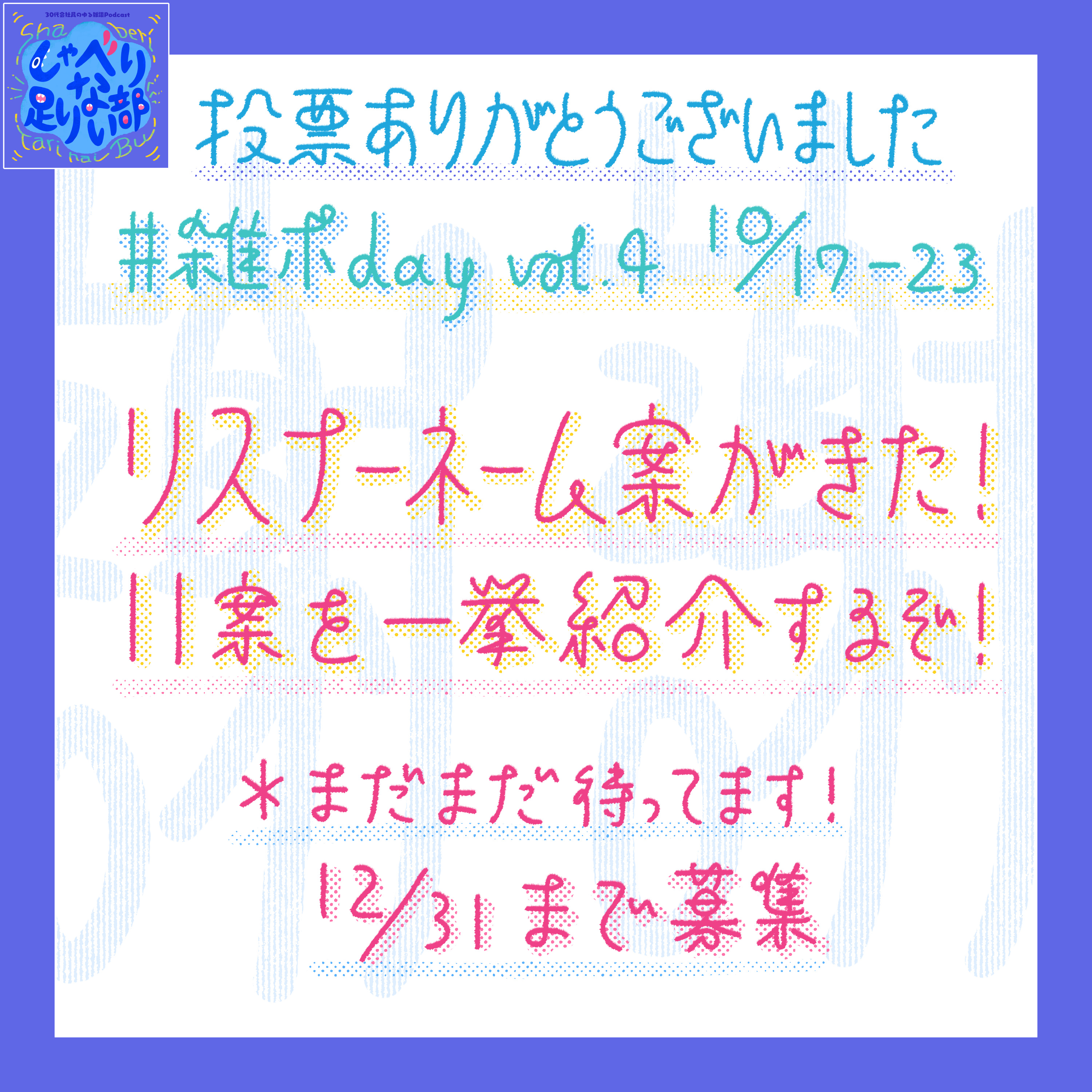 でですね、今日は何の話をしていくかと言いますと、ちょっと久しぶりめの配信なんですけど、前回雑談系ポッドキャストの日の告知をしたんですけれども、その改めての告知をちょっと挟みまして、その後に前回募集していたリスナーネーム案がなんとありがたいことに届き始めました。