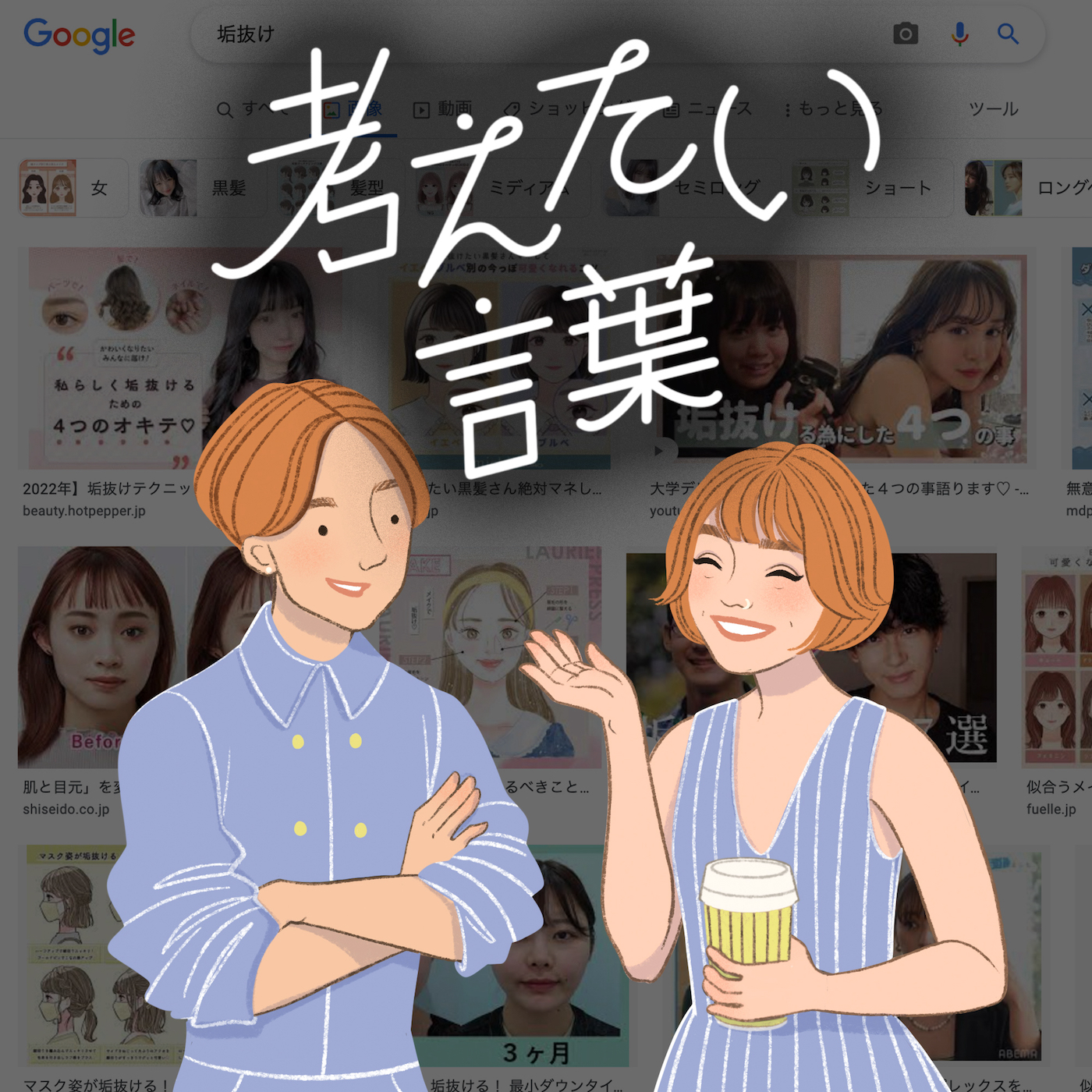 グーグル検索結果のスクリーンショット 「垢抜け」は、主に外見が過去の自分と比べ洗練されることを指す。ヘアスタイルやファッション、スキンケア、メイクアップなどさまざまな要因での変化があり、ソーシャルメディアでは近年その“ビフォー”と”アフター”のインパクトを題材にしたコンテンツが多く見られる。英語でも、“輝く(glow)”と“成長する(grow up)”を掛けた“グローアップ(glow up)”という表現がほぼ同意義で使われている。「垢抜け」の逆として「芋っぽい」などの表現が使われることが多い。垢抜けるためにすることのリストによく上がるのは、髪色を変える、ダイエットで痩せる、トレンドの洋服を着ることやメガネを外す、“癖毛”を直毛にするなど。アメリカではそれに加え、歯列矯正が外れる時期とよく関連づけられる。垢抜けの像が確立されることで、自分自身の髪の毛のテクスチャー、体型・骨格や肌の色などを“直すべき”ものと捉えられてしまう可能性もある。個性を活かすどころか、“美の基準”を強化することになるとも言える。言葉の本来の意味は、垢や汚れが落ちてさっぱりし、本来の姿に近づいたというニュアンスで「一皮むける」や「原石を磨く」という表現と共通するイメージがある。最近の海外の「グローアップ」のトレンドでは、社会の目を気にしていた過去と、周りの目を気にせず自分らしい格好ができるようになった現在を比較するようなコンテンツも増え、「垢抜け」の本来の意味を再考することにつながるかもしれない。