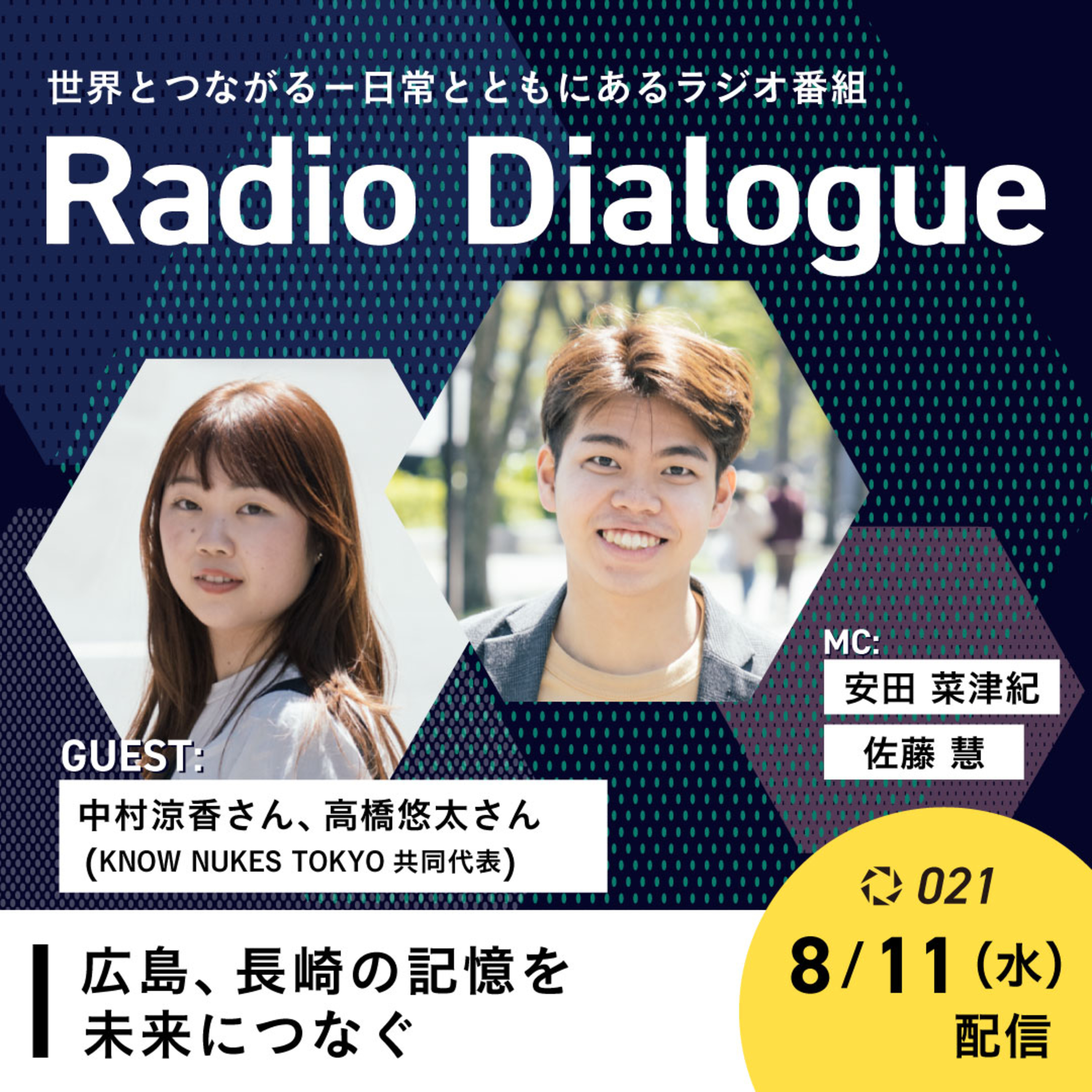 世界には約1万3000発の核兵器が存在するといわれます。2017年7月7日、「核兵器禁止条約」が国連加盟国の6割を超える122か国の賛成により採択されました。その後2020年10月24日には、条約の発効条件である50ヵ国の批准に達し、翌2021年1月22日、発効となりました。しかし核保有国は同条約の批准を拒んでおり、米国の「核の傘」に頼る日本もそうした国のひとつです。今回は、核兵器廃絶、被爆者の記憶・体験を未来につなぐための活動を行っている「KNOW NUKES TOKYO」共同代表の中村涼香さん、高橋悠太さんにお話を伺います。