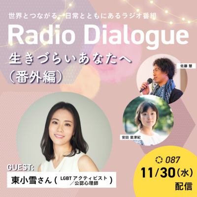 「生きづらいあなたへ」はD4P YouTubeチャンネルの番組のひとつで、LGBTアクティビストの東小雪さんと、安田菜津紀とのゆるやかな対談番組です。「しんどい」「明日が不安」という気持ちがあったとき、「まずはそれを持ち寄れる場を築いていきたい」との思いから始めました。しばらく更新できずにいましたが、今回はRadio Dialogueでお送りする「番外編」として、今年の出来事をまったりと振り返っていきます。性的マイノリティの方々の置かれている昨今の状況や、重大ニュースが続く中、どのように心の状態を保つのかなど、みなさんのコメントと共にお送りしていきます。