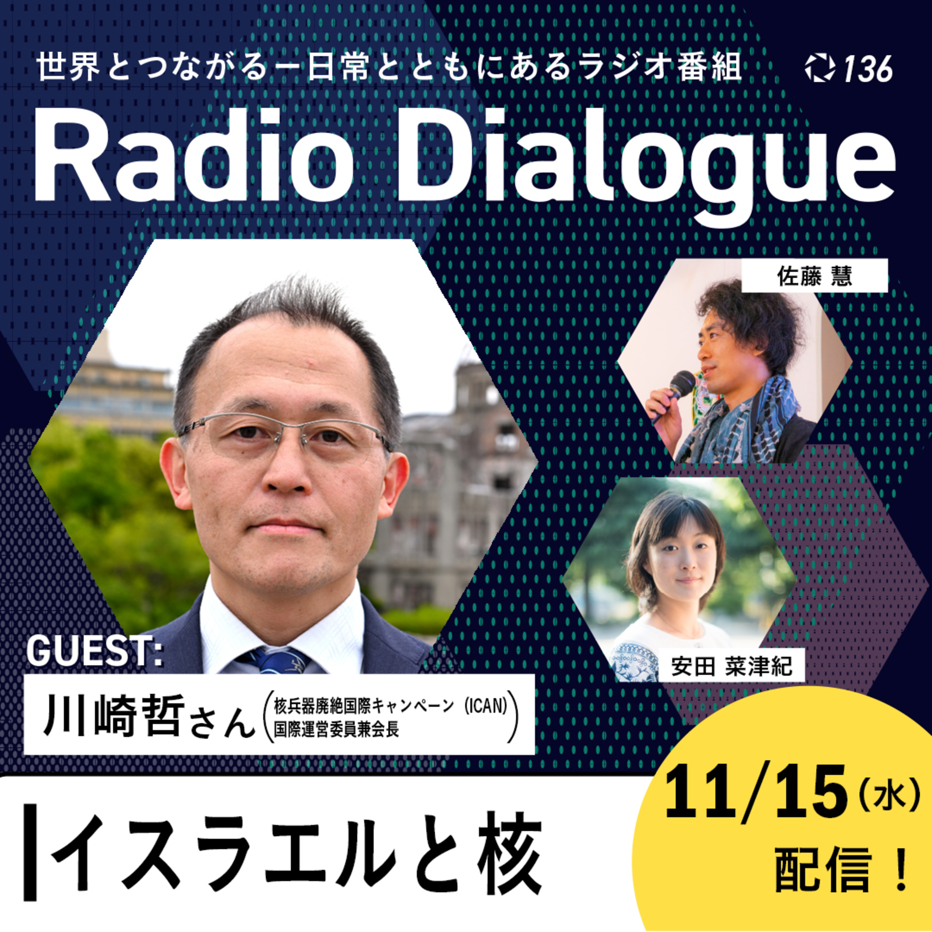 ▶136(2023/11/15)「イスラエルと核」 MC:安田菜津紀、佐藤慧 ゲスト:川崎哲さん(核兵器廃絶国際キャンペーン(ICAN)国際運営委員兼会長) 先日イスラエルの閣僚がラジオ番組で、ガザへの核兵器使用は「選択肢のひとつ」と答えました。 1996年に国際司法裁判所が出した勧告的意見では、核兵器を使用するとの威嚇も「人道法の原則及び規則に、一般的に違反する」と結論付けられています。今回の閣僚の言動は国際法に反するのではないか――など、イスラエルと核について、2017年にノーベル平和賞を受賞した「核兵器廃絶国際キャンペーン(ICAN)」国際運営委員兼会長の川崎哲さんにお話を伺っていきます。 【ゲストプロフィール】 川崎哲さん(核兵器廃絶国際キャンペーン(ICAN)国際運営委員兼会長) ピースボート共同代表。2017年にノーベル平和賞を受賞した「核兵器廃絶国際キャンペーン(ICAN)」の国際運営委員兼会長(2012~14年同共同代表、14年から国際運営委員、21年から会長兼任)。核兵器廃絶日本NGO連絡会の共同代表として、NGO間の連携および政府との対話促進に尽力してきた。ピースボートでは、地球大学プログラムや「ヒバクシャ地球一周 証言の航海」をコーディネート。2009~2010年、日豪両政府主導の「核不拡散・核軍縮に関する国際委員会(ICNND)」でNGOアドバイザーをつとめた。恵泉女学園大学、立教大学などで非常勤講師。日本平和学会理事。著書に『核兵器禁止から廃絶へ』(岩波ブックレット、2021)、『核兵器はなくせる』(岩波ジュニア新書、2018)など。2021年、第33回谷本清平和賞受賞。1968年東京生まれ、東京大学法学部卒業。
