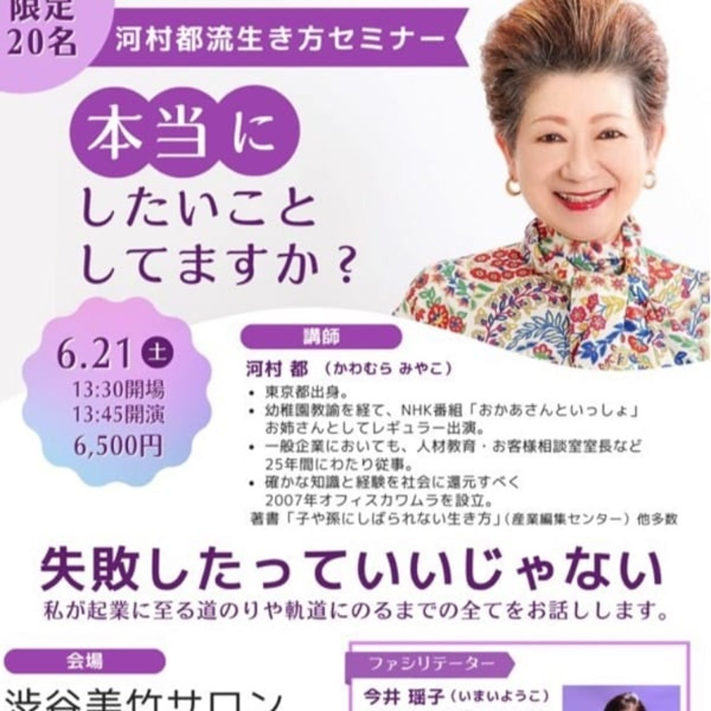 だから、これから6月21日に開催します河村みやこさんとのセミナーの話ばっかり。やっぱりもうちょっとね、テーマを絞るということをした方がいいのかなというふうに反省しましたが、